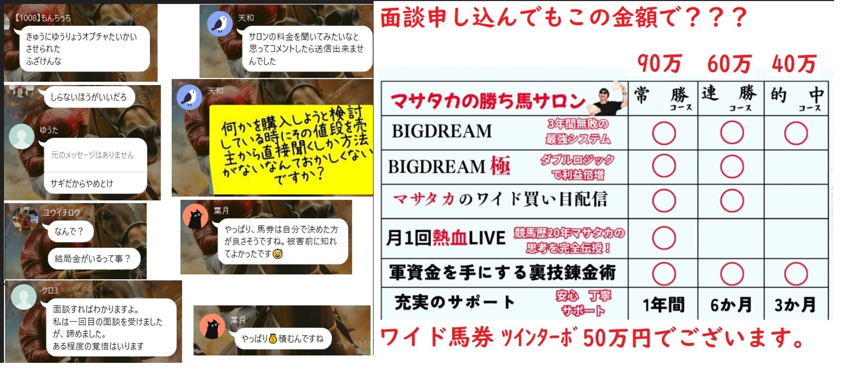 - マサタカの競馬予想の評判は?ネットでの評価を徹底解説!これがマサタカさんの無料予想の餌につられて面談を申し込むと表示される料金でございます。無料予想に群がるセコイ連中がこの金額を出せると思いますか?面談を担当する人には、私のように40万円振り込みますと歩合が入ると思います。私ならご褒美で20万円出しますが、実際は担当者に聞かないと本当の金額はわかりません。「実は私はアルバイトでマサタカさんのビッグドリームの勧誘のバイトをしていましたが、セコイ奴らばかりで、金額を言うとビックリして固まってしまい、それ以上先に進めませんでした。結局一人も勧誘できないのでやめました。相変わらず今回が最後、と面談募集していますが、無駄だと思います。」・・・・とこのように内幕を暴いてくれる人おりませんか?1.0