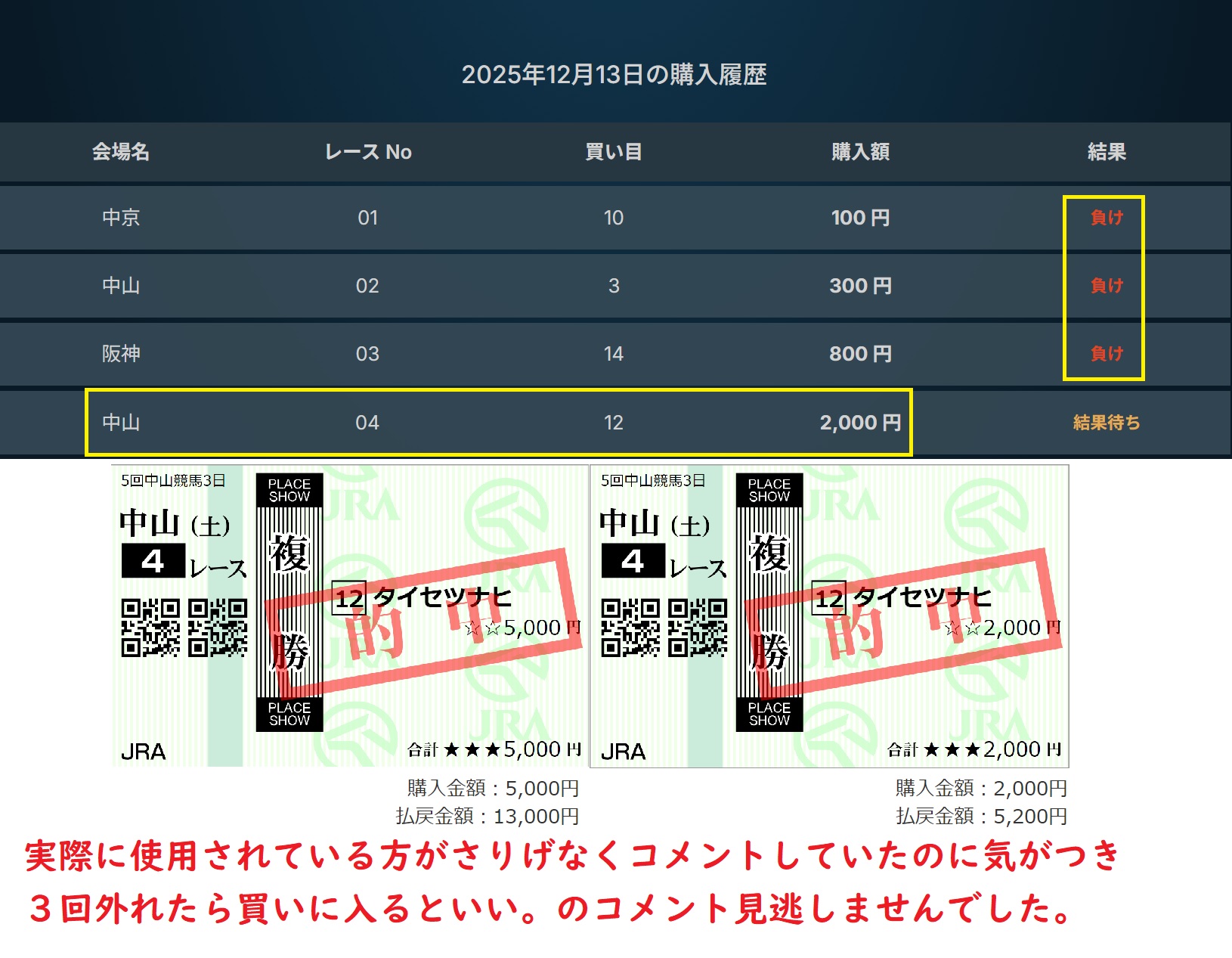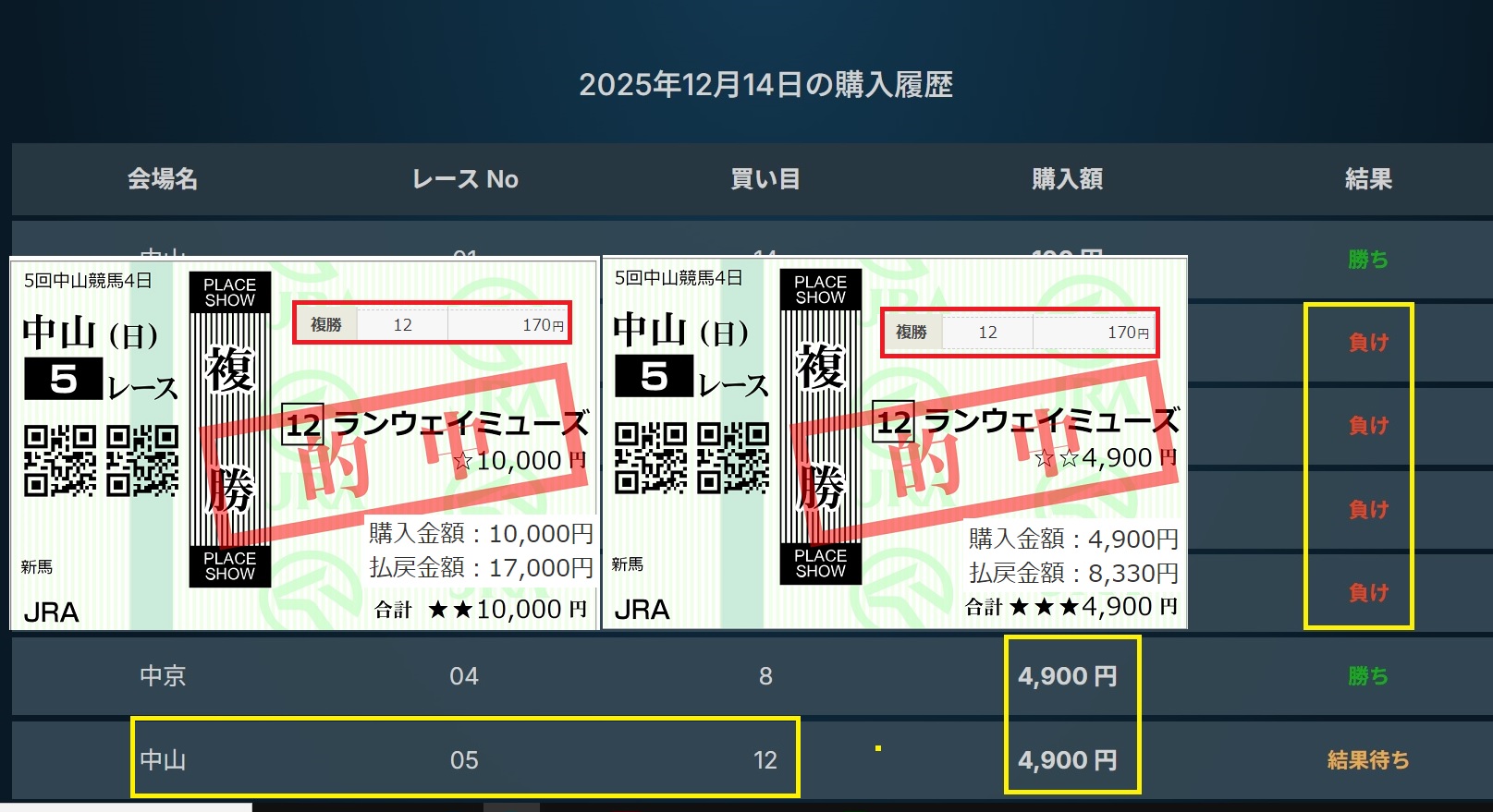 - マサタカの競馬予想の評判は?ネットでの評価を徹底解説!「ビッグドリームは100円、300円、800円買っていたのでは儲かりません。 3回外れたら購入のパターンが一番利益がでそうですね。」と書きましたが12月14日も阪神1R,中京2R,中山3R,阪神3Rと4レース連続で外したのでそろそろ当たるのでは?と、思っていたら中京4Rの8番に4900円の買いが入ったので見ていたら8番が3着で的中したので、今までのパターンから次も当たると確信したら、中山5Rの12番に4900円の買いが自動的に入ったので、12番の複勝に1万円追加して合計14.900円的中しました。このように自分なりにアレンジすればビッグドリームも使えます。40万円払っているのでなんとか元を取ろうと必死でございます。3.0