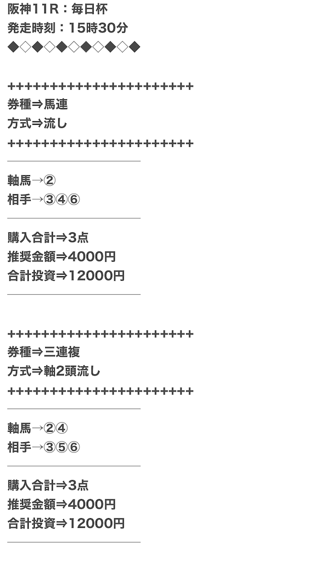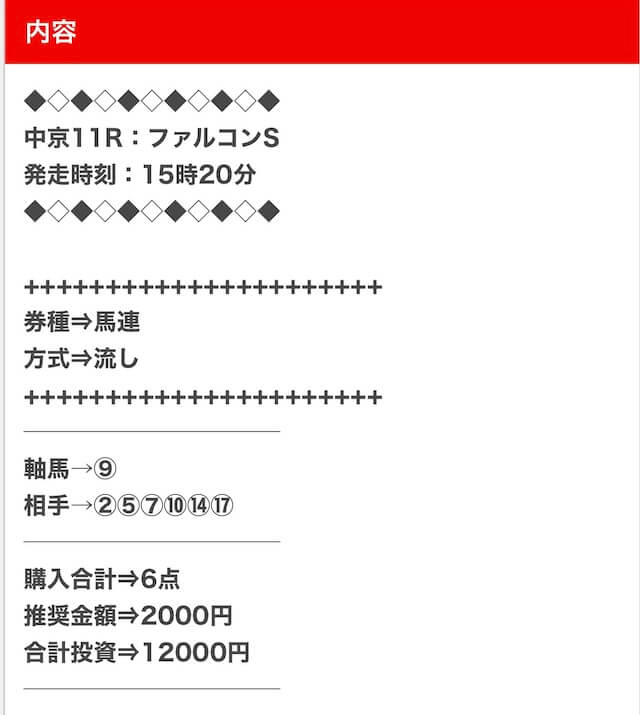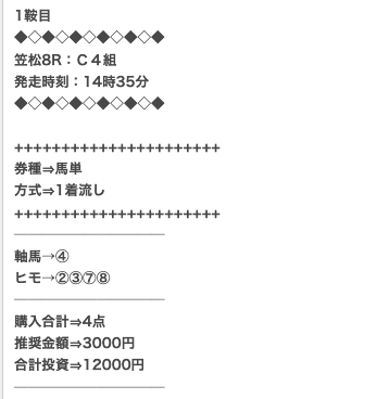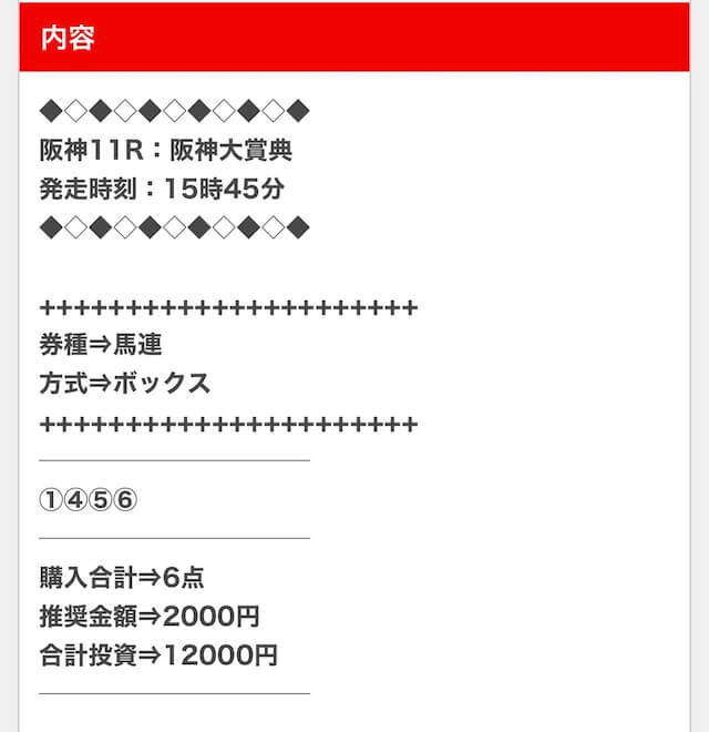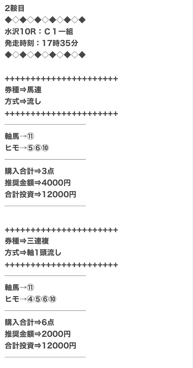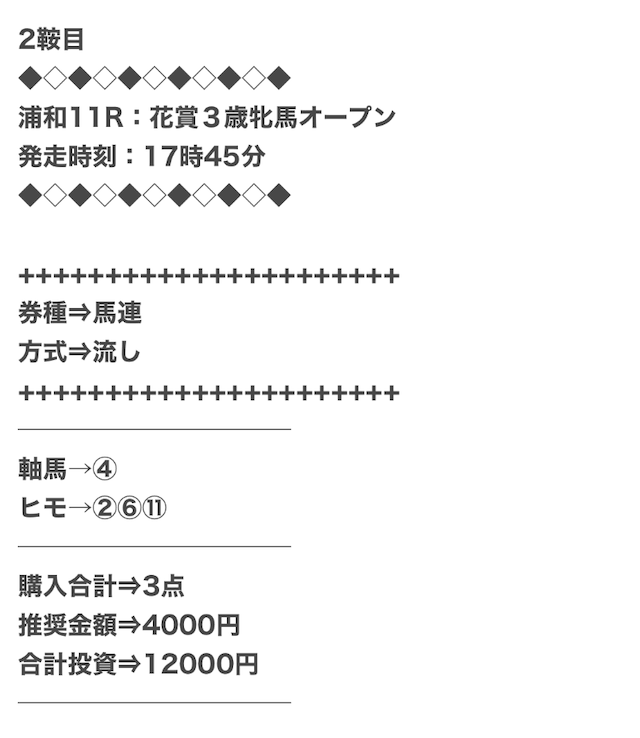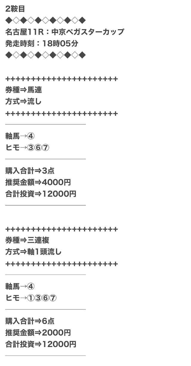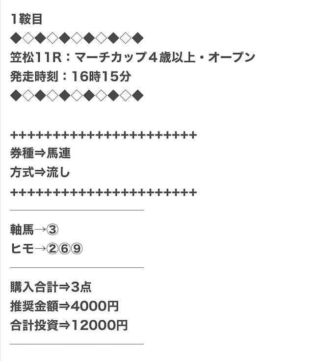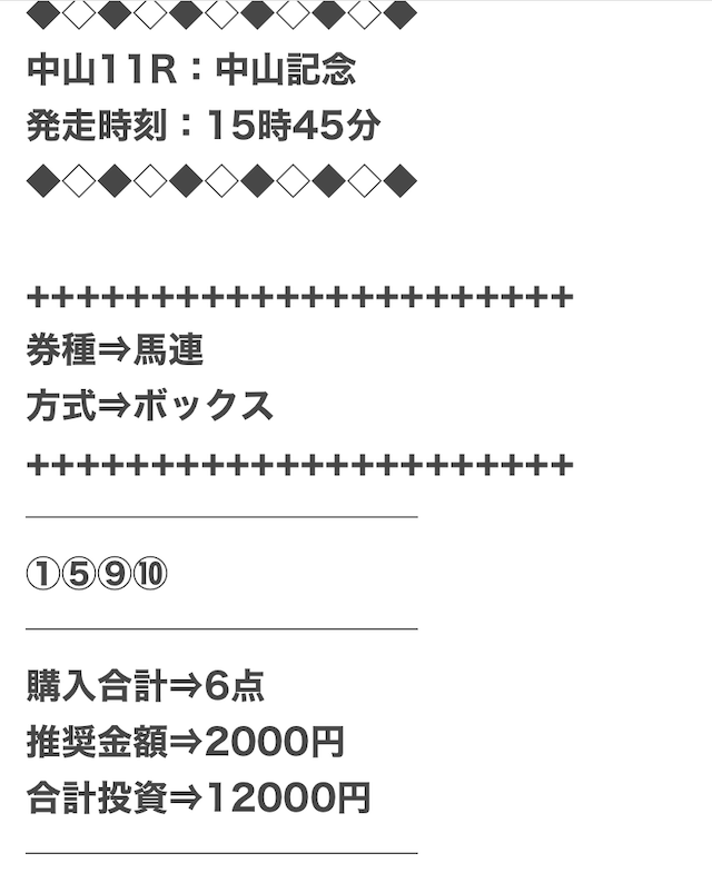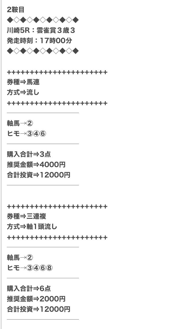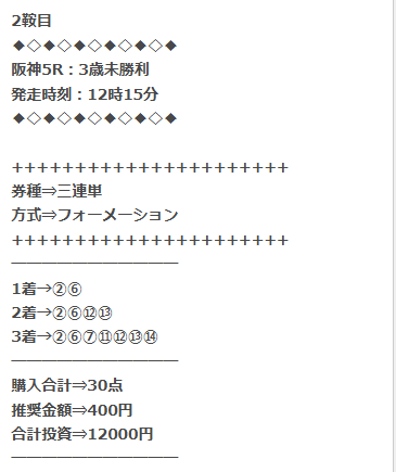 1点2,000円で馬券の購入を推奨しているので、指示通りに購入しました。