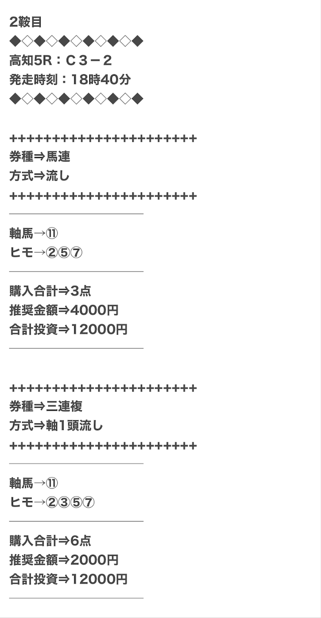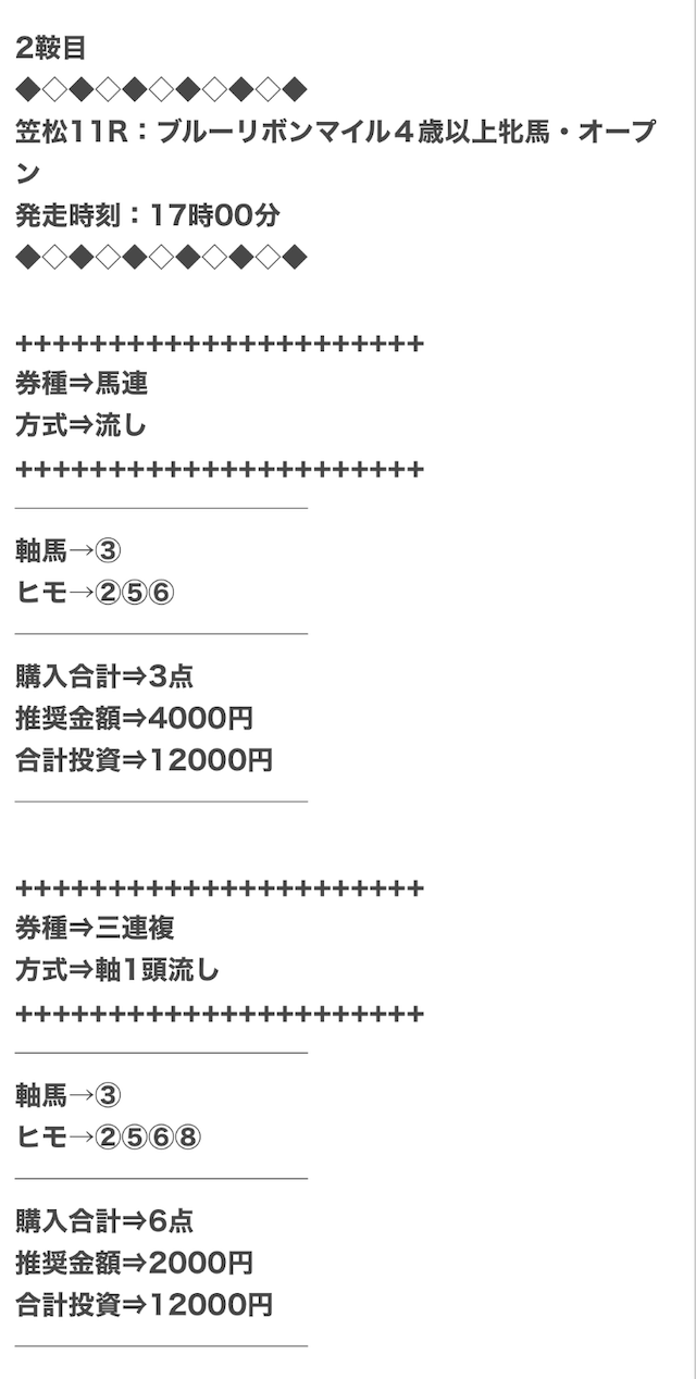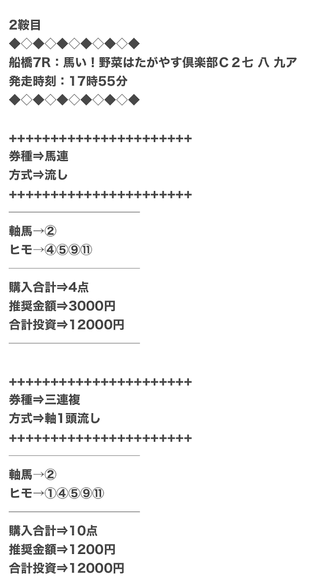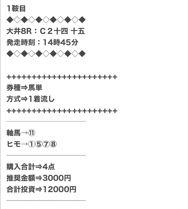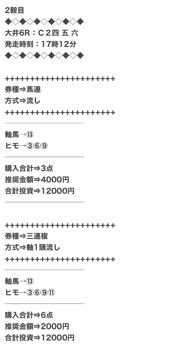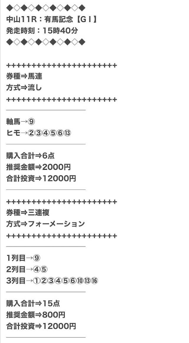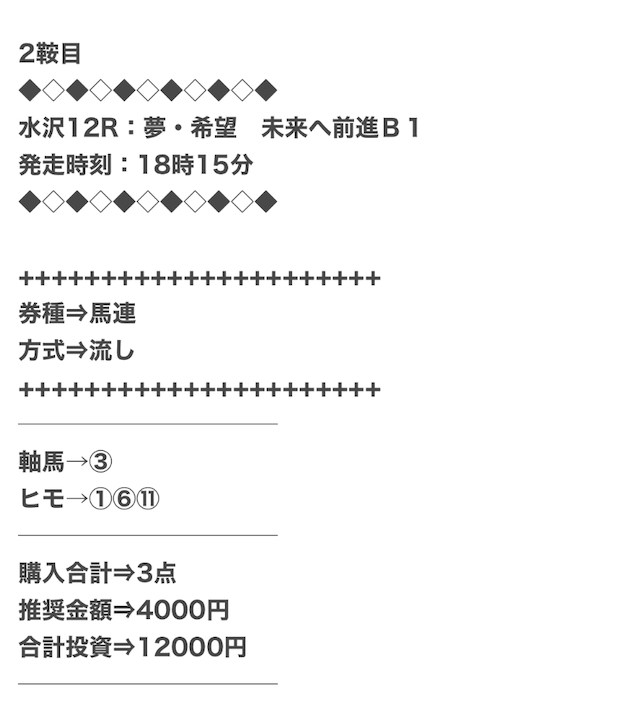 1点2,000円で馬券の購入を推奨しているので、指示通りに購入しました。