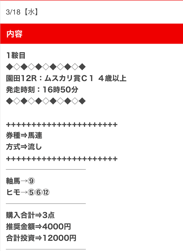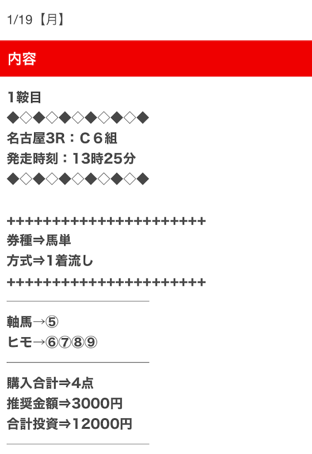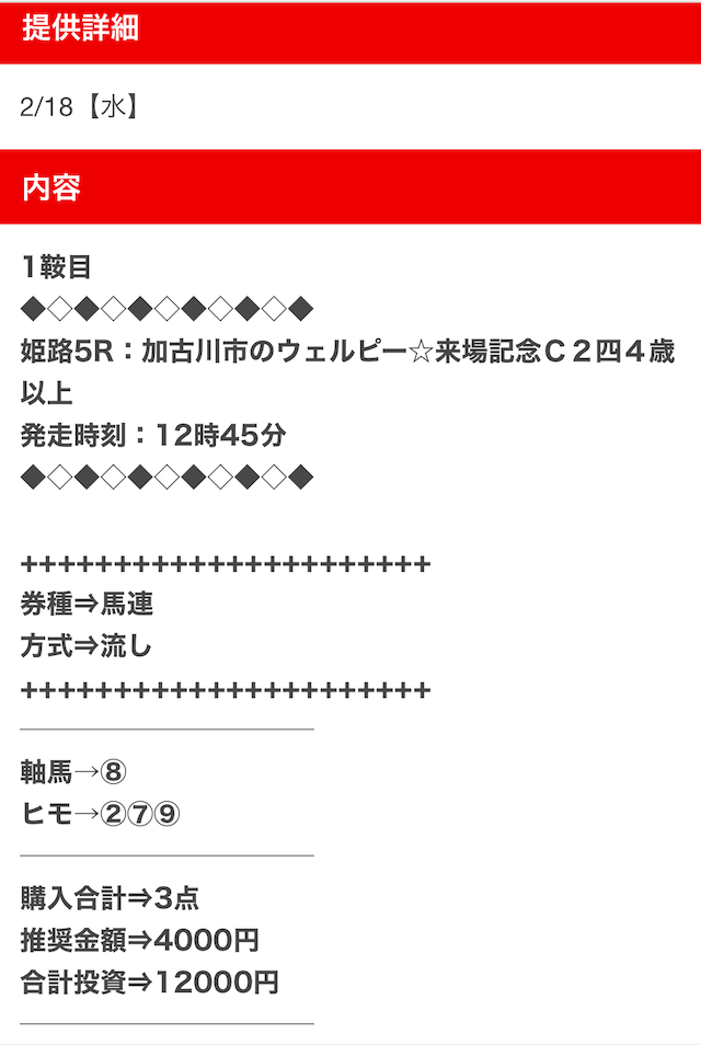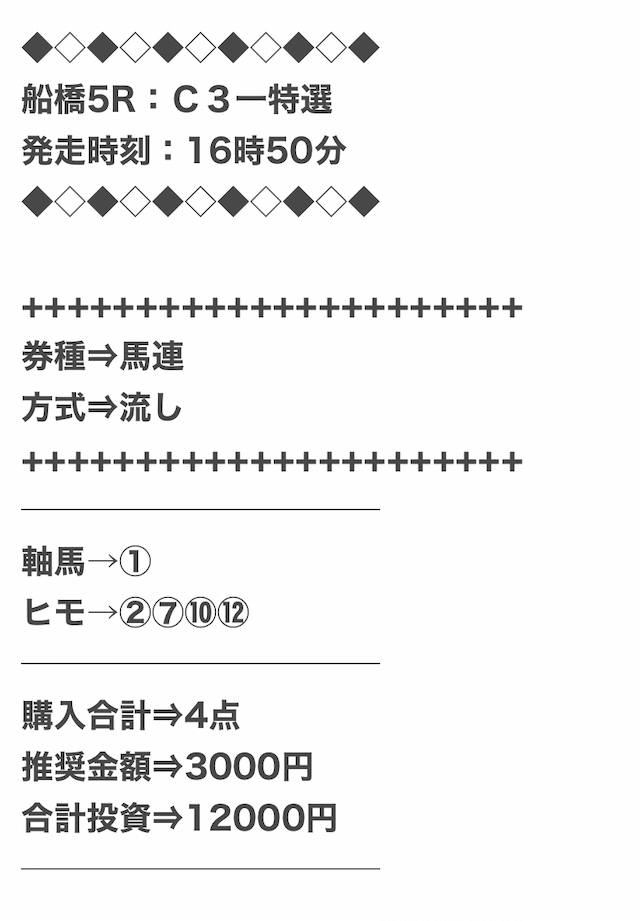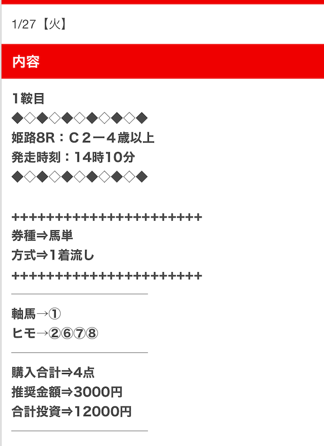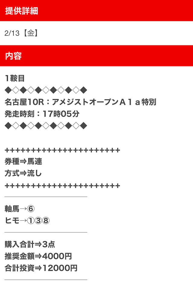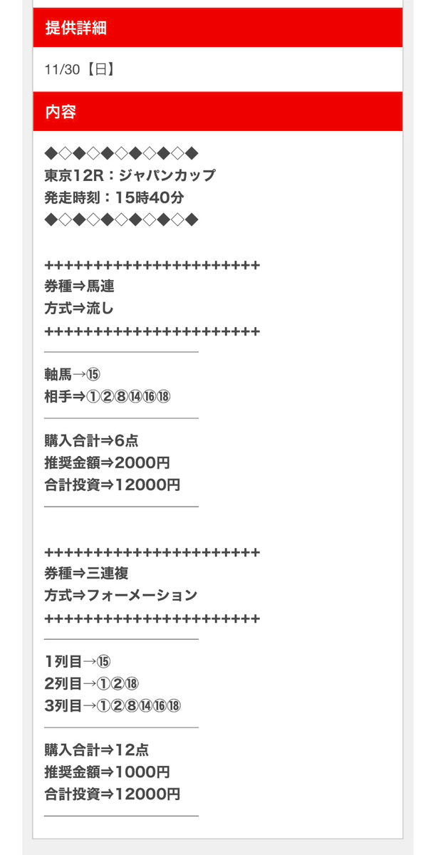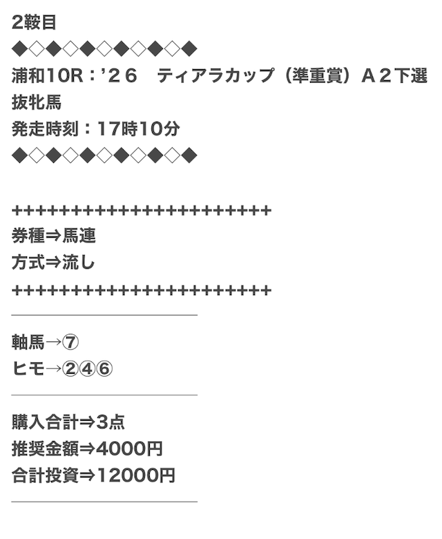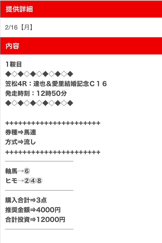 1点2,000円で馬券の購入を推奨しているので、指示通りに購入しました。