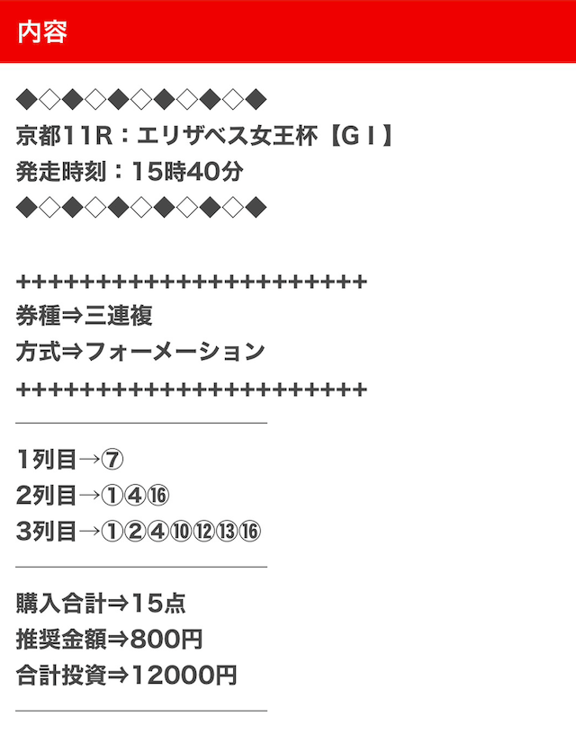 買い目点数は16点で1点700円で馬券の購入を推奨しています。