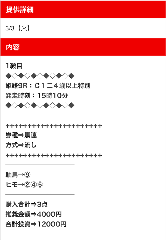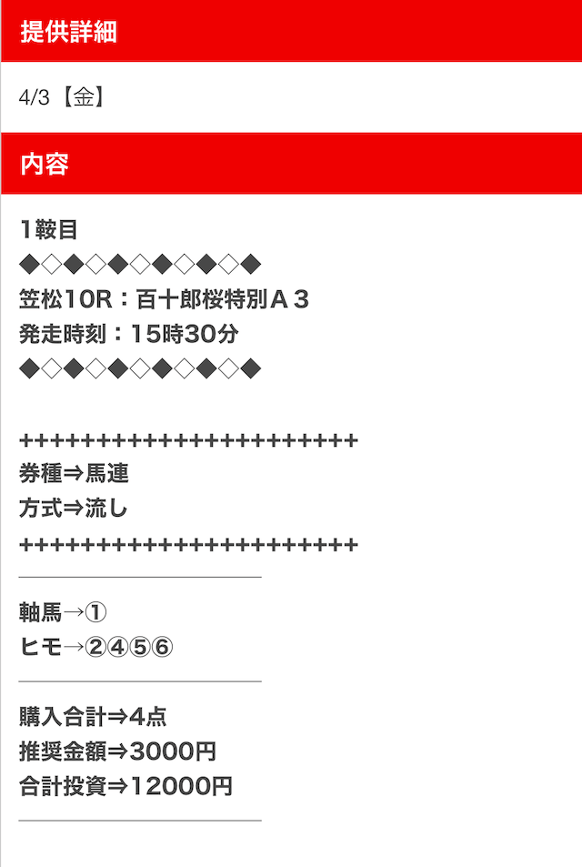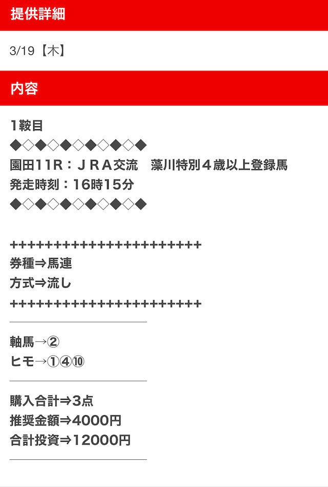 また登録特典で付与される10,000円分のポイントを使えば、数千円で3鞍の買い目が受け取ることもできそう。