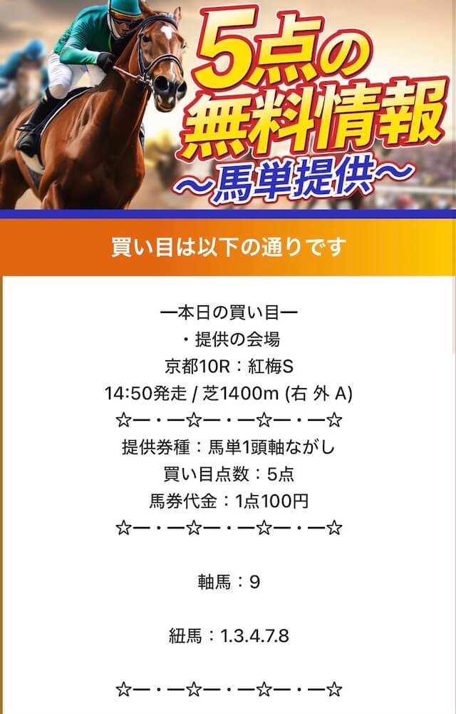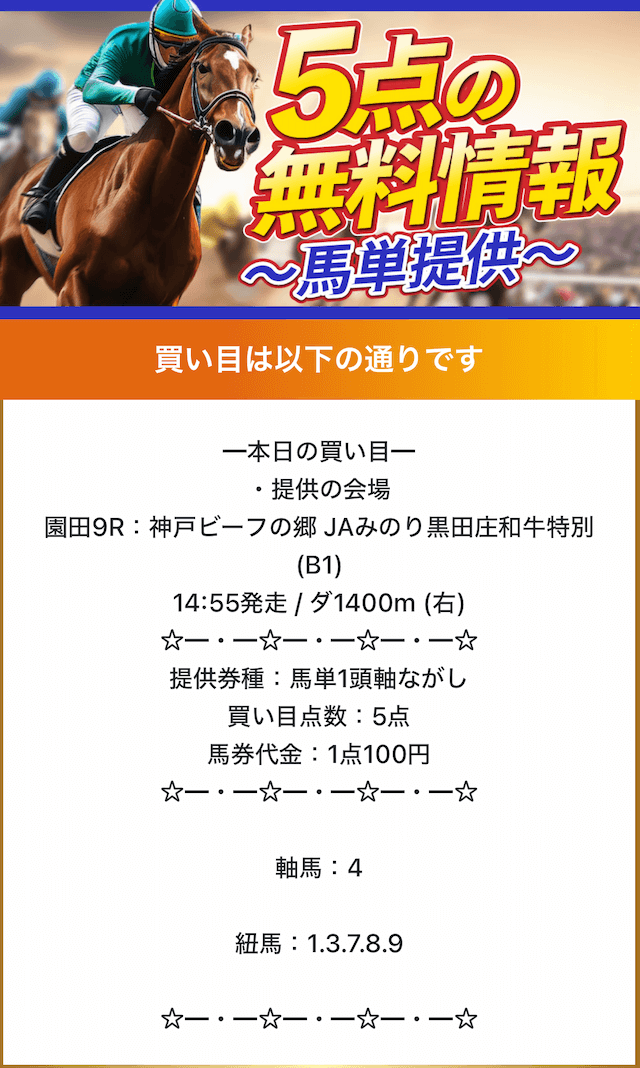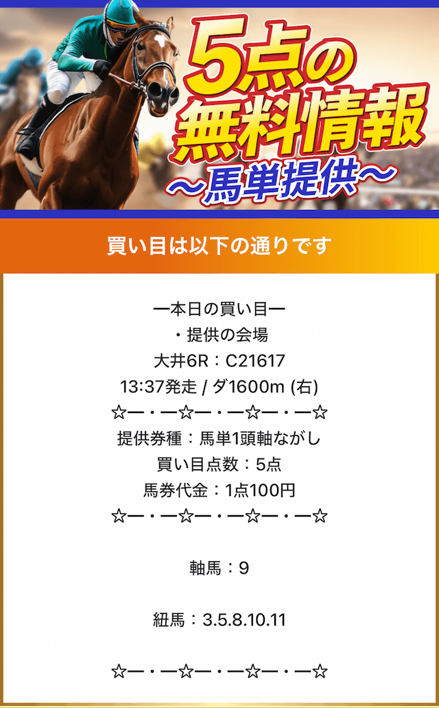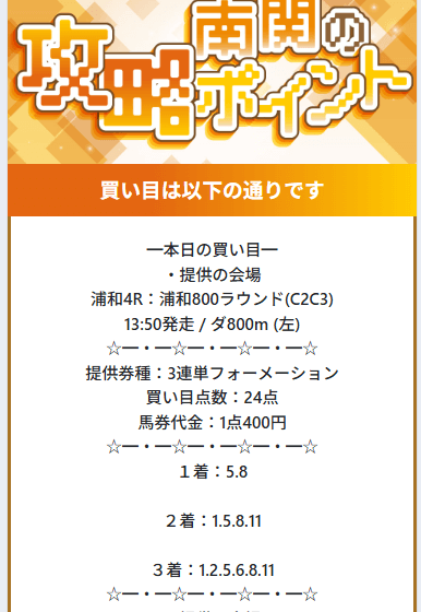 無料予想では、ワンコインから参加できる買い目を提供しており、365日毎日予想を公開しています。