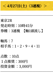 今レースは、2,7番人気を軸とした3連単フォーメーションで予想を公開。