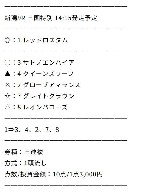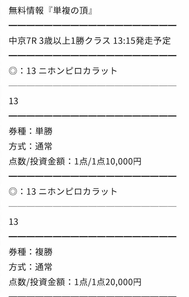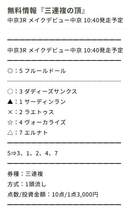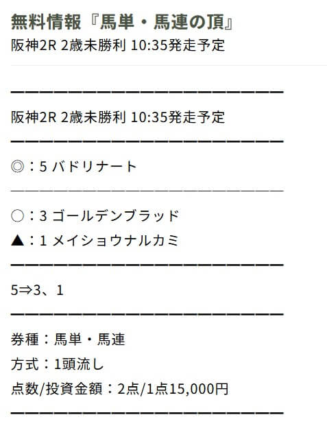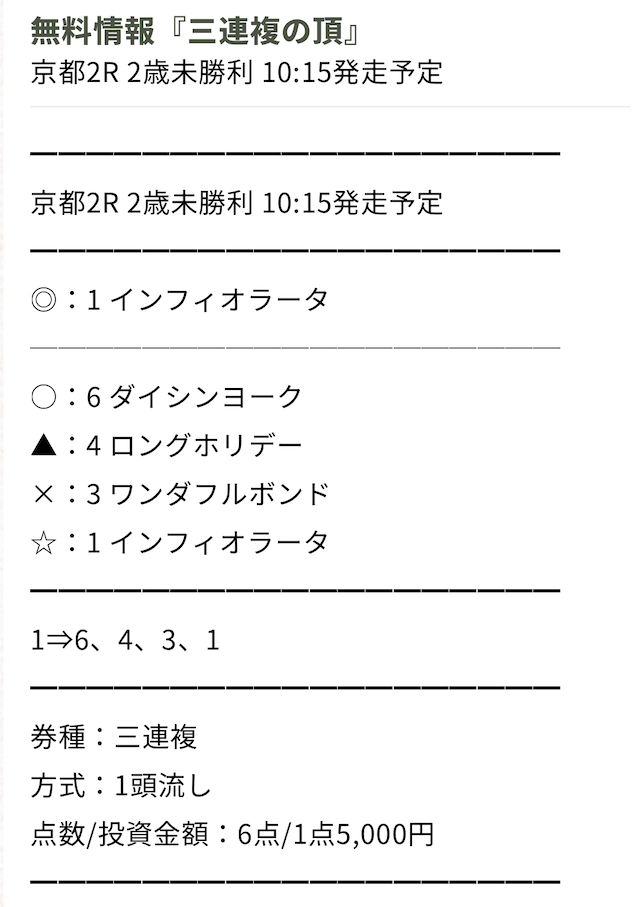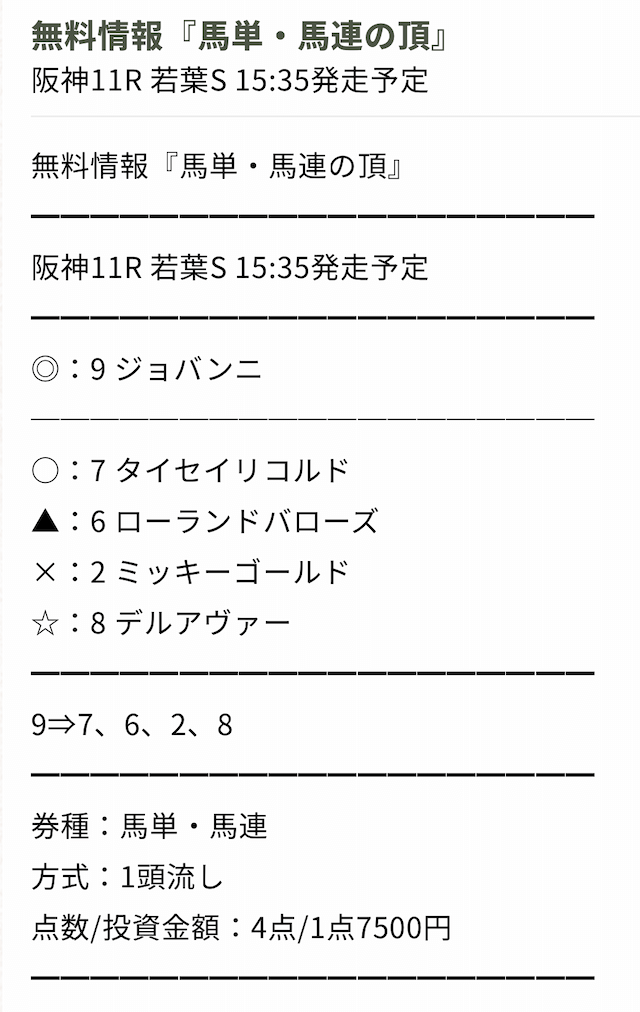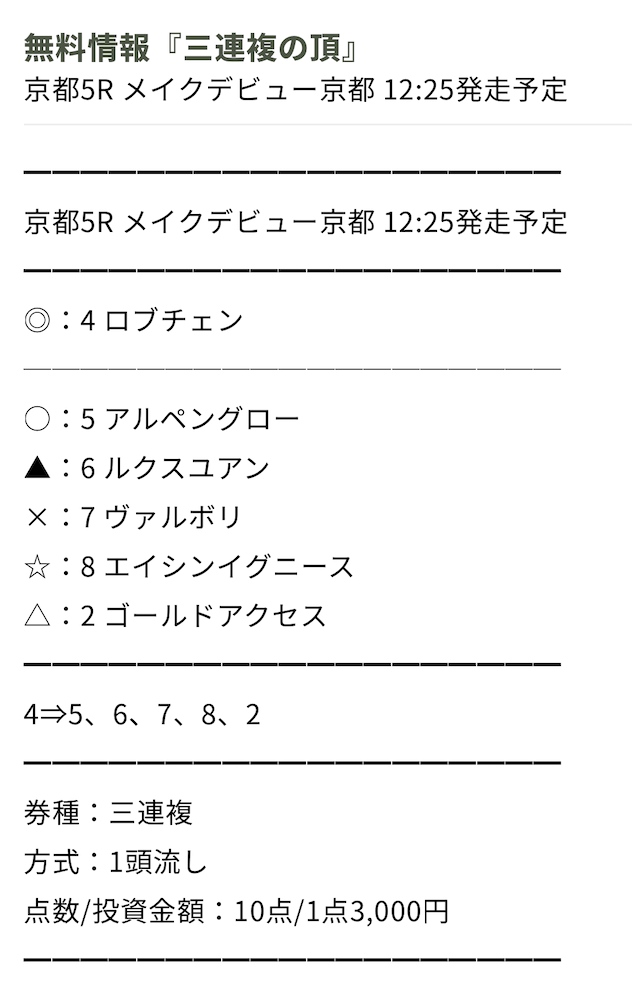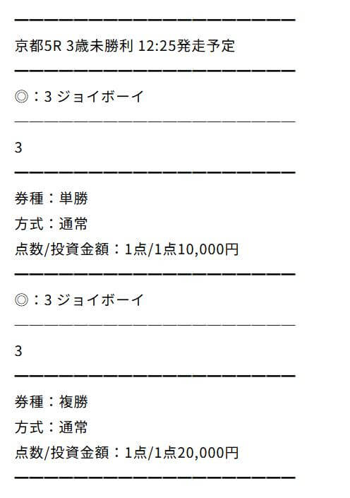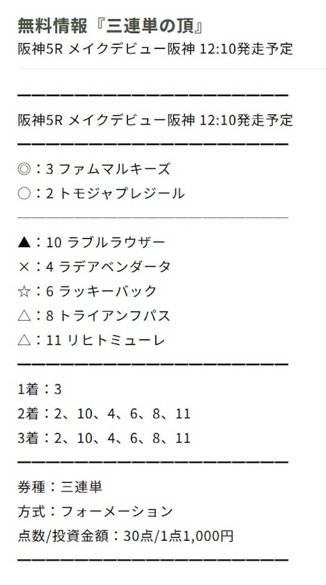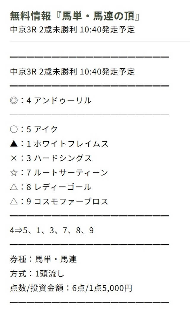 一応当たることは当たるんだけど、ほとんどがトリガミで、プラスになる気配がまったくない。配当も笑っちゃうくらい低くいレベル。馬券代だけがどんどん消えていく感じ。ハッキリ言って、時間もお金も無駄にしただけでした。おすすめできません。