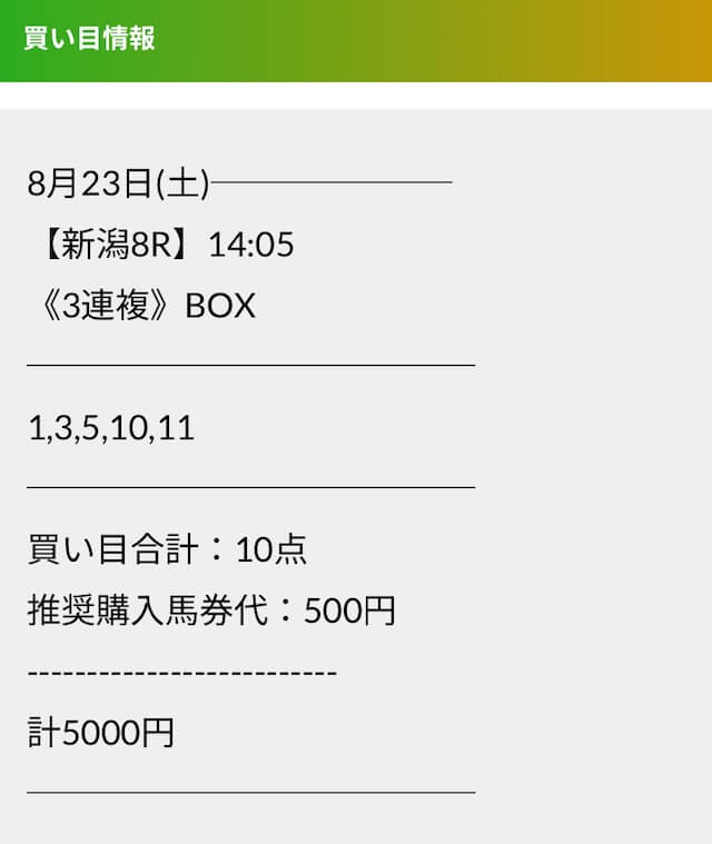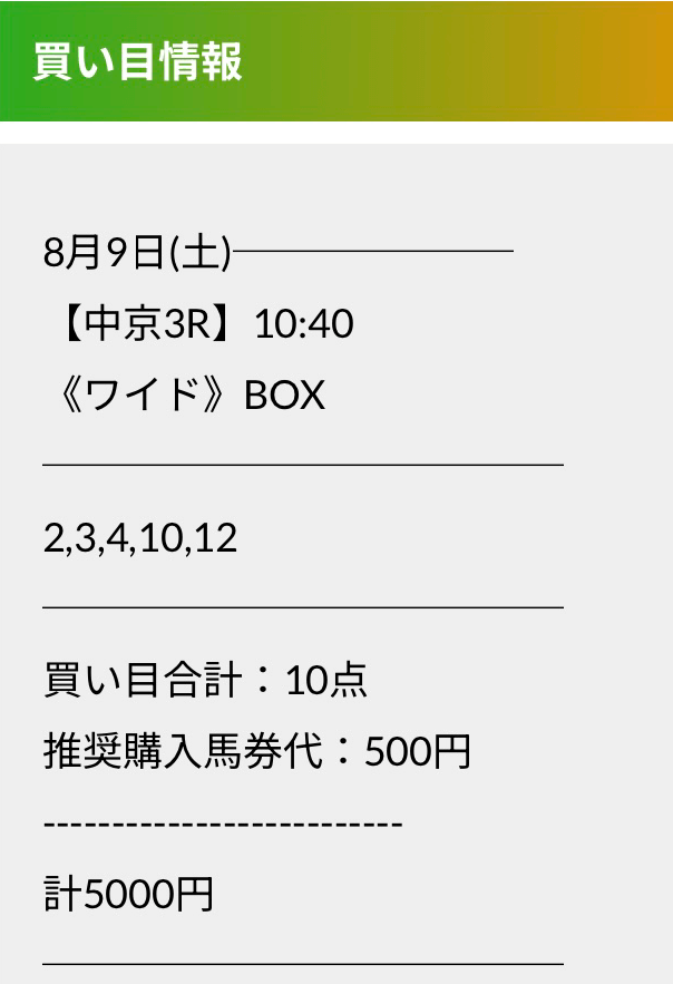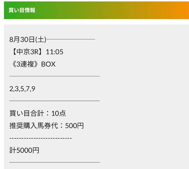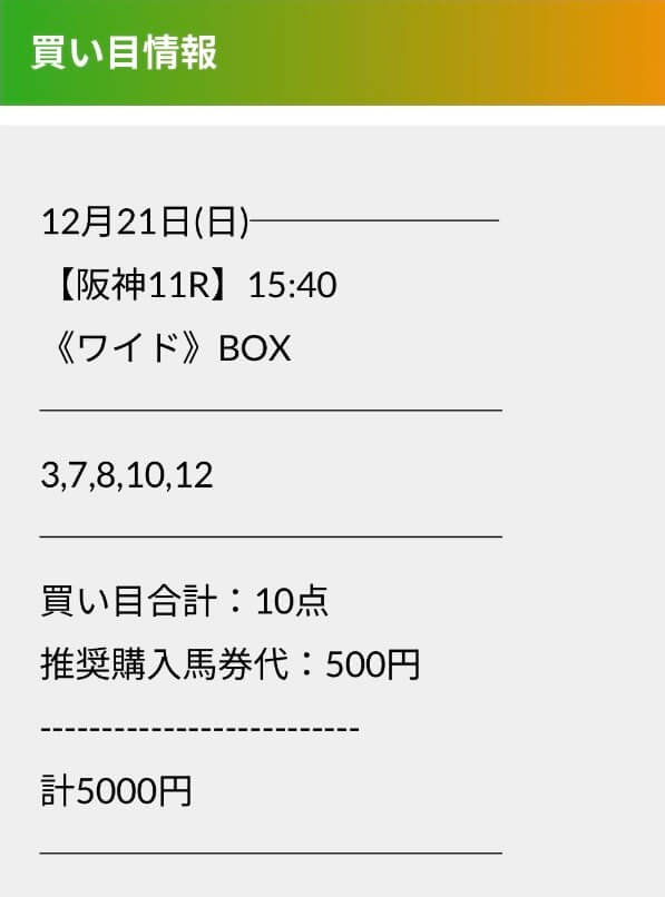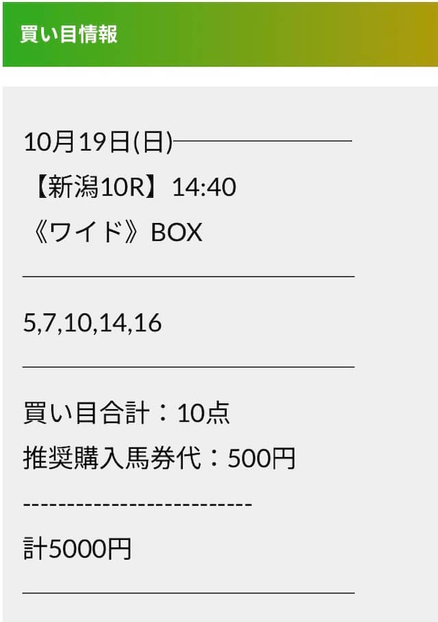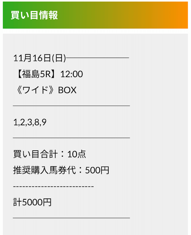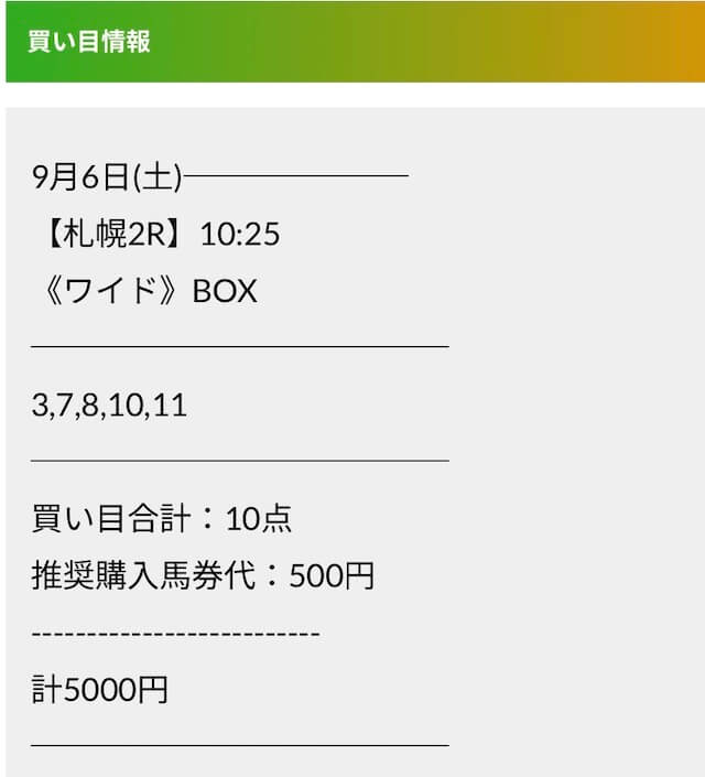 券種は3連複とワイドで、それぞれ1鞍ずつとなっています。