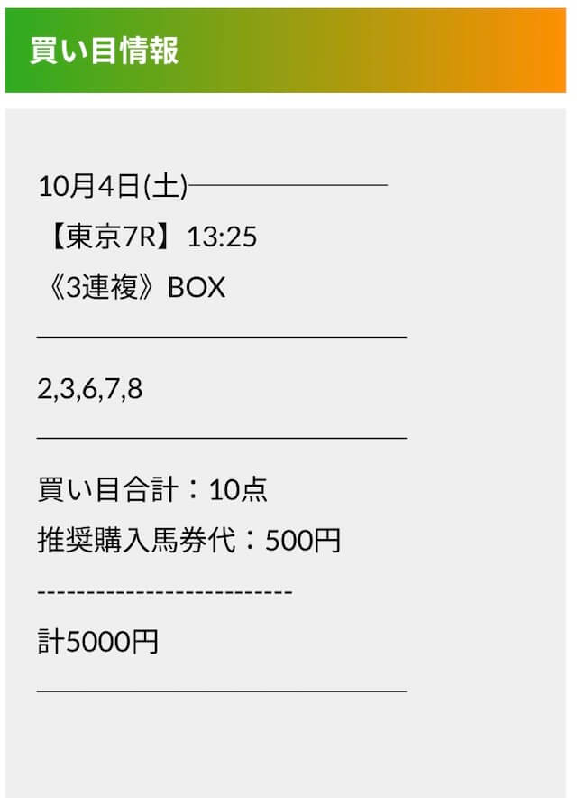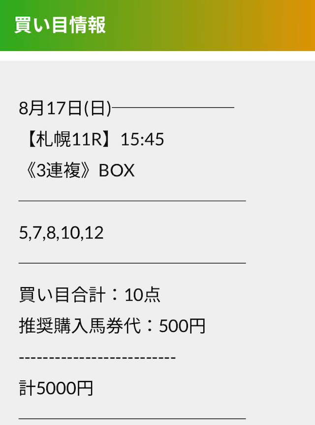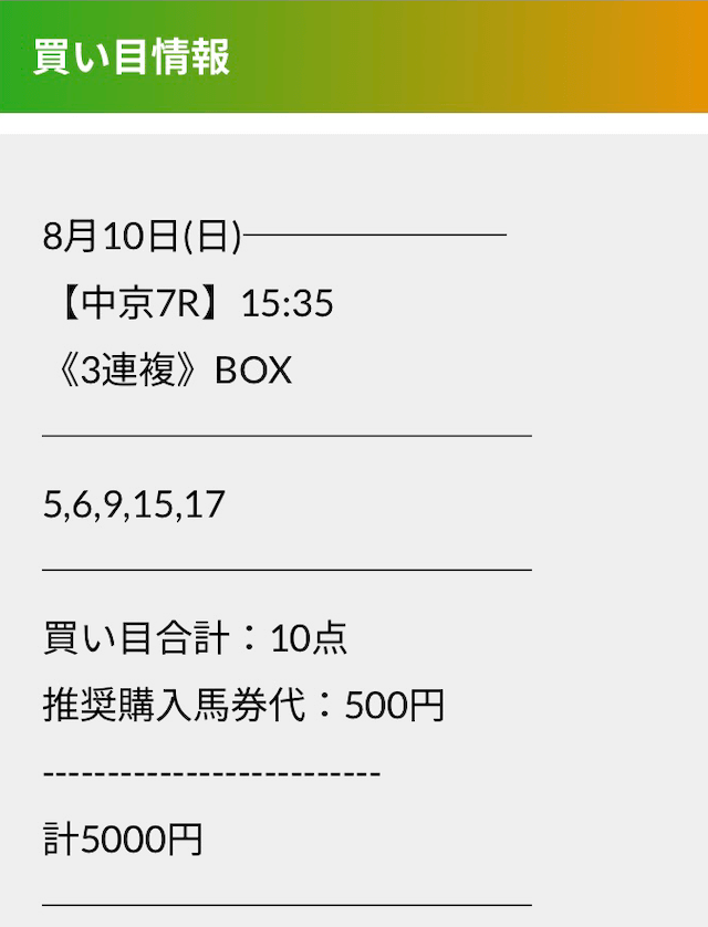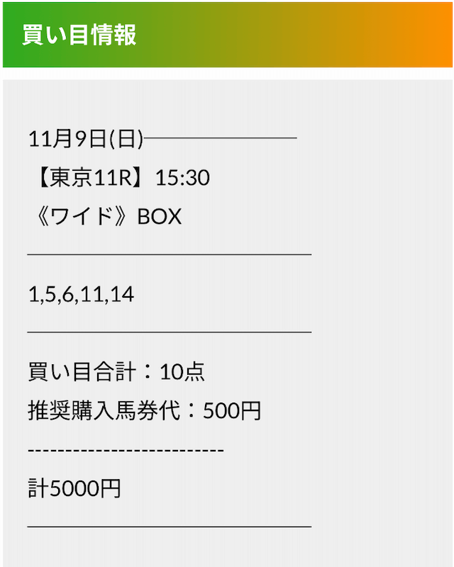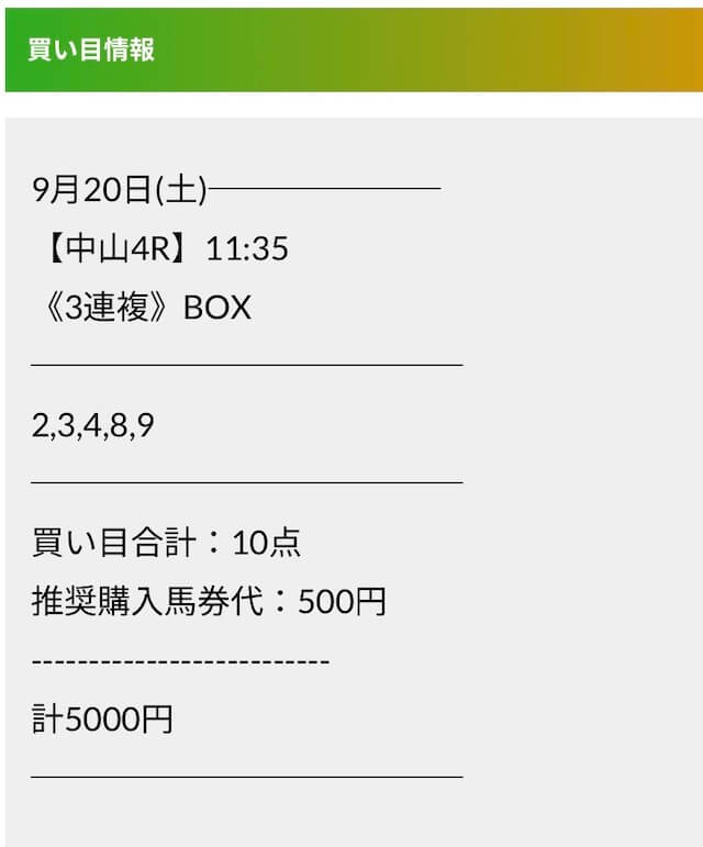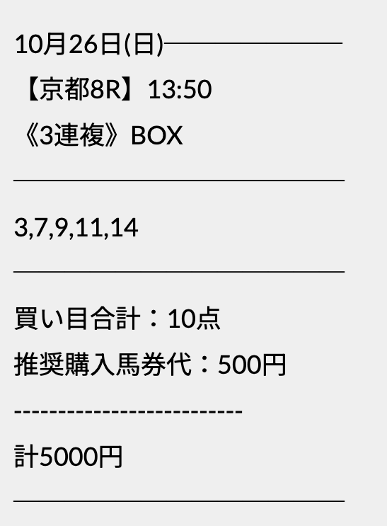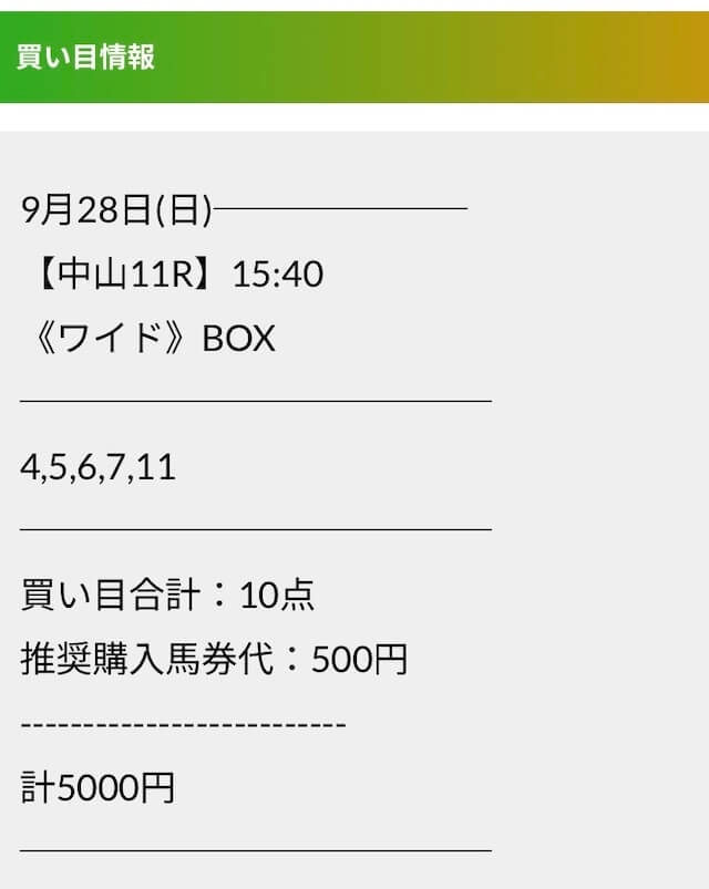 券種は3連複とワイドで、それぞれ1鞍ずつとなっています。