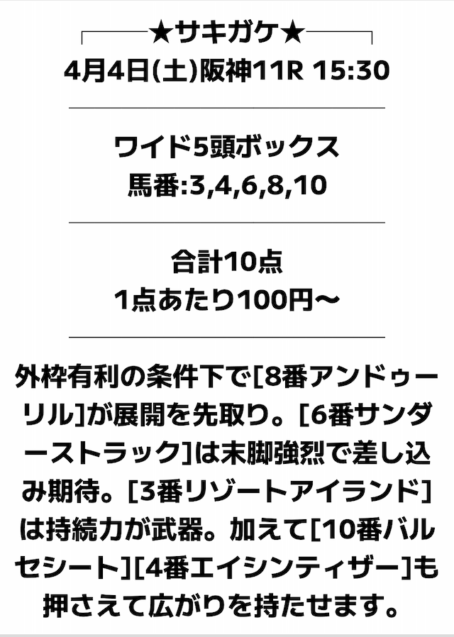 | 2026/4/12/阪神11R | △ | 5,600円 | 10,000円 | -4,400円 | ワイド |