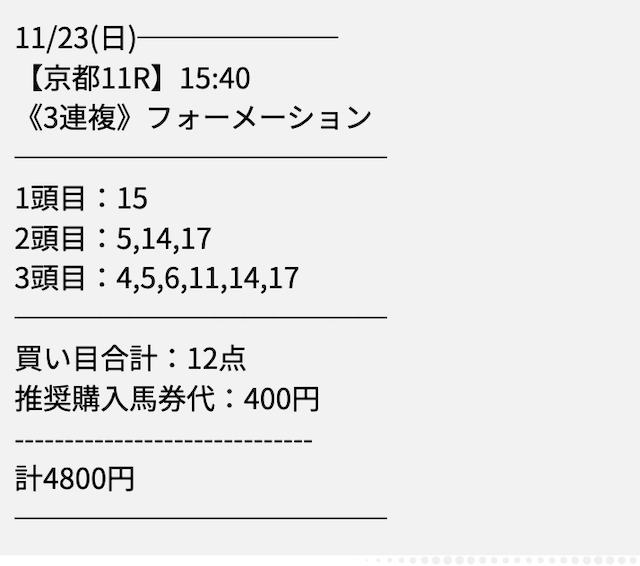 正直、有料情報の料金はちょっと高めだな〜って思ったけど、実際に使ってみたら万馬券が当たってビックリ!しかも配当もかなり高くて、一発で元取れたどころかだいぶプラスに。最初は迷ったけど、勝てる内容ならこの金額でもアリ。