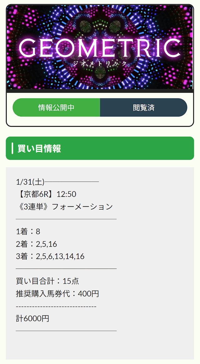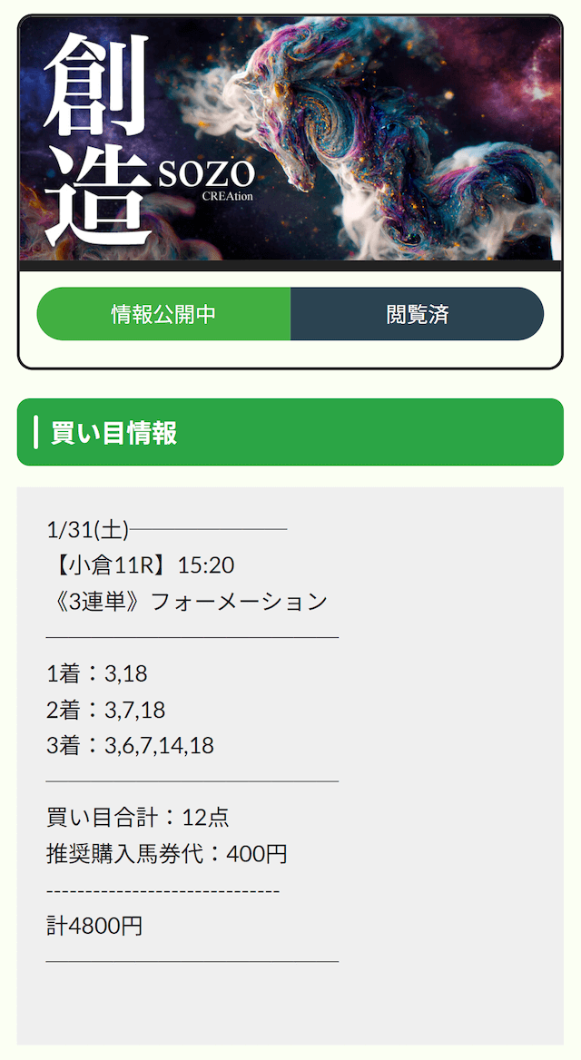料金429,000円馬券代5,400円的中!収支+1,254,240円プラン名 戦績 的中率 回収率 収支 合計費用 払い戻し 常勝ヴィクトリー 1勝0敗 100% 238.5% +110,100円 79,500円 189,600円 灯火-Tomoshibi 1勝0敗 100% 307.7% +907,560円 437,000円 1,344,560円 創造 1勝0敗 100% 486.3% +559,400円 144,800円 704,200円 ジオメトリック 1勝0敗 100% 200.6% +263,680円 262,000円 525,680円 必勝フロー 1勝0敗 100% 866.1% +470,380円 61,400円 531,780円 灯火-Tomoshibi- 1勝0敗 100% 388.7% +1,254,240円 434,400円 1,688,640円 この成績は、まさに文句なしのトップクラス!