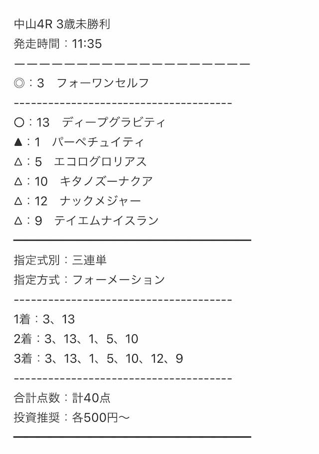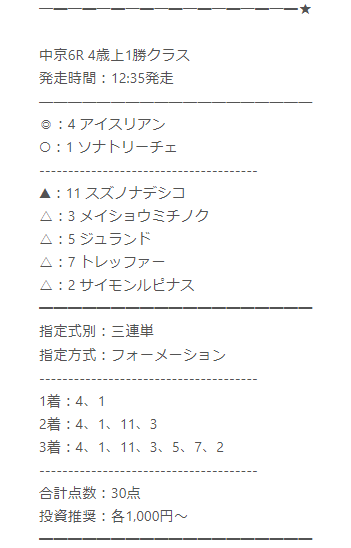 オッズを見る限り大きなマイナスにはならなそうですが、情報料金を支払っているからにはしっかり勝ちたいところです。
