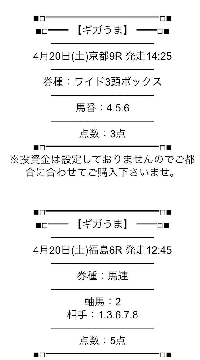 一方、ギガうまの有料予想は値段に対する想定の回収率が3〜500%。
