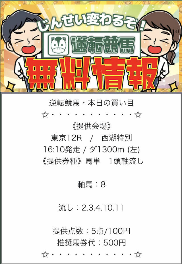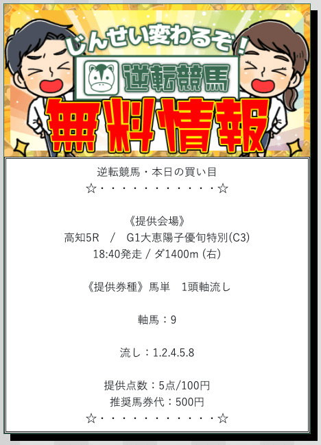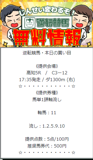 無料予想では馬単かつ5点というなかなかない形ながら、抜群の馬選びで高い回収率を記録。