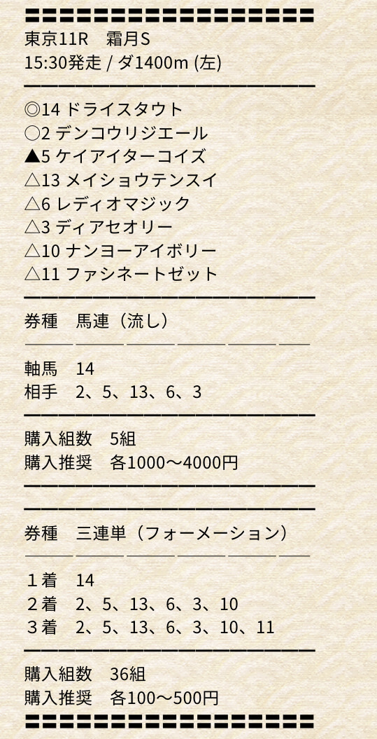 その他にも人気最下位のシンソーブを買い目に加えており、読みどおりにいけば大きな配当が狙えそうという印象。