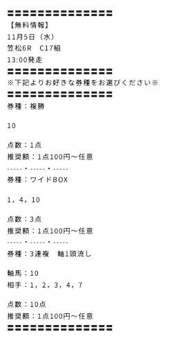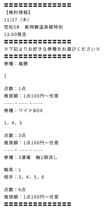 無料情報今のところ3券種全部はずれたの一回だけ。