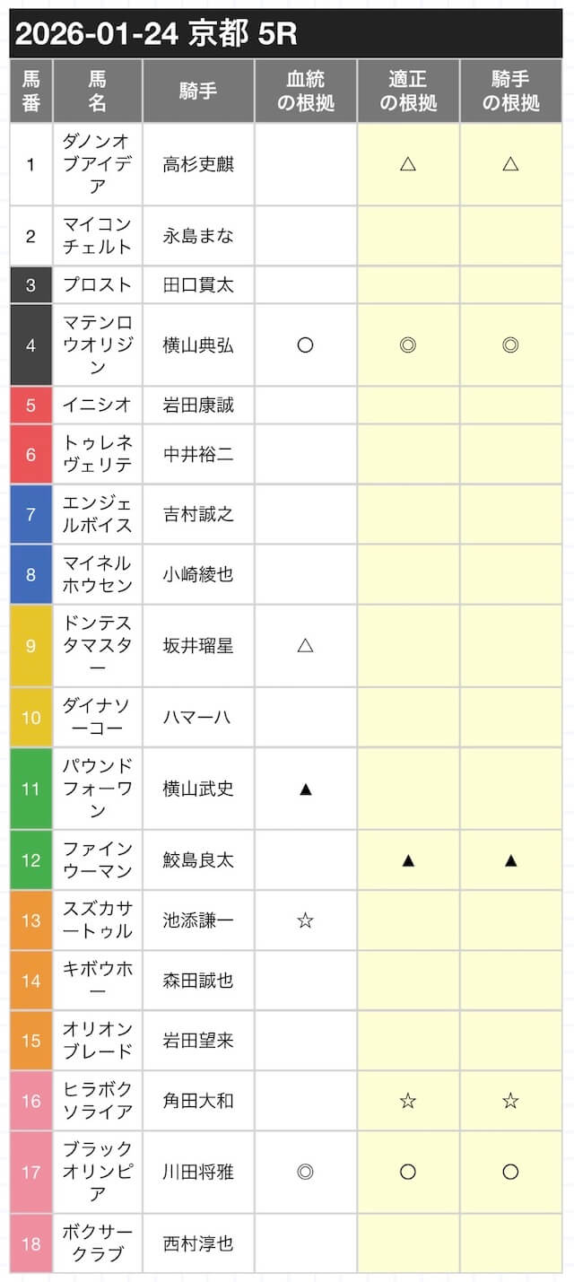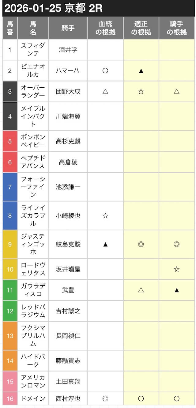 「血統・適性・騎手」の3つの根拠に基づき、各馬に予想印が付けられていました。