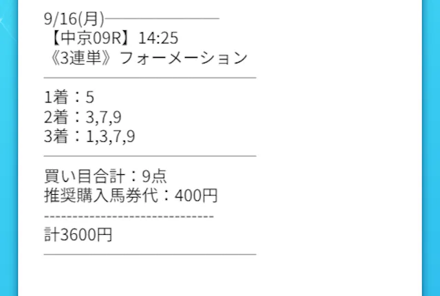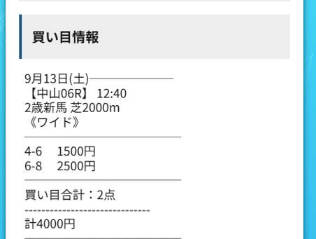 | ’24/09/16 中京9R | 投資ドリブン | ◯ | +61,760円 | 38,000円 3,600円 | 103,360円 |