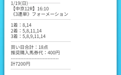 | ’25/1/19 中京12R | 17人の証言 | ◯ | +477,720円 | 198,000円 7,200円 | 581,120円 |