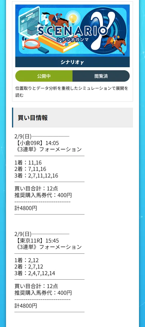 | ’25/02/09 小倉9R 東京11R | シナリオガンマ | ✕ | -57,600円 | 48,000円 4,800円 4,800円 | 0円 |