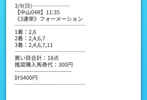 | ’25/03/09 中山4R | 馬心伝心 | ◯ | +681,120円 | 78,000円 5,400円 | 764,520円 |
