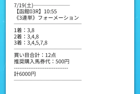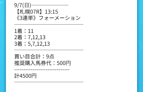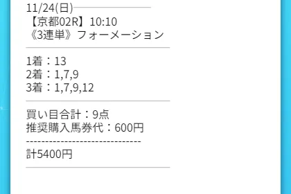 回収率がとにかく高いし、当たったときの配当も想像以上にデカすぎる・・しかも、一レースごとの買い目がめちゃくちゃ絞られてて、無駄な出費もないからかなり助かってます。