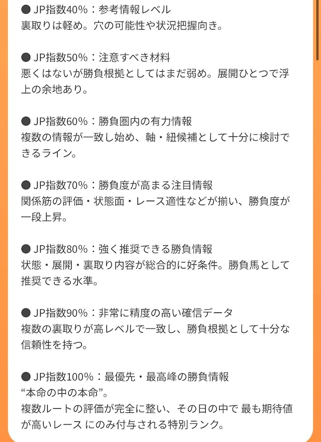 JP指数は、数値(%)が高いほど信頼度の高い情報を示す指標で、安定した結果と高い回収率の両立を目指している点が特徴です。