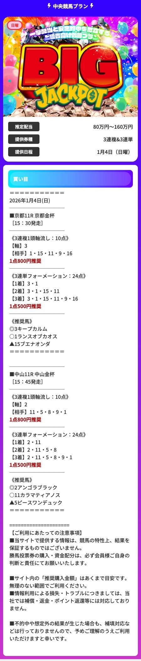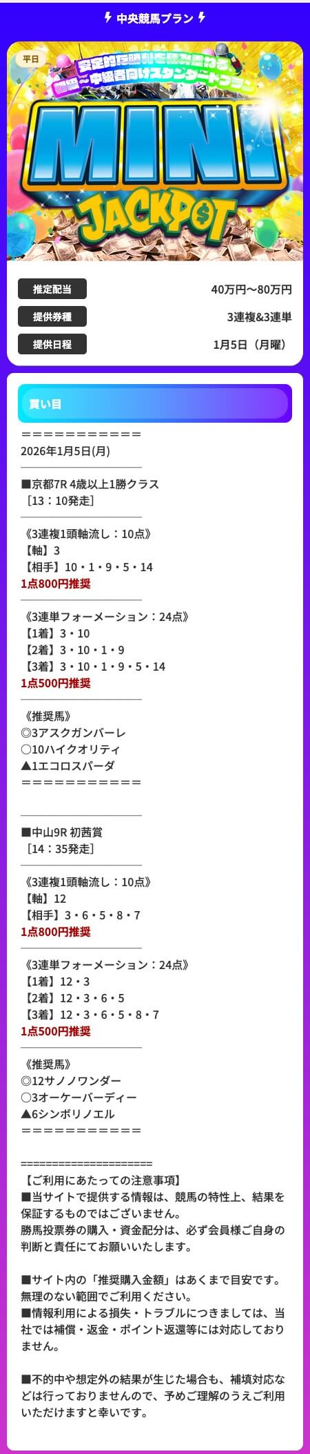 このプランでは1セットで4鞍分の買い目が公開され、合計馬券代は20,000円。