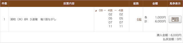 - 馬券代:1点1,000円 計6,000円