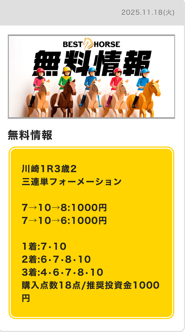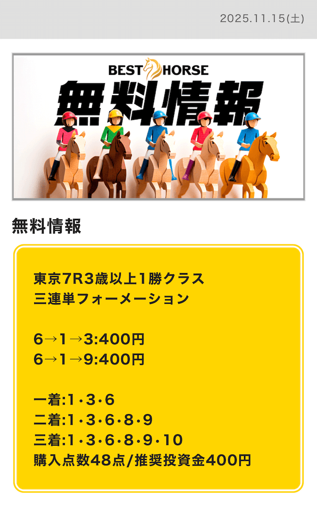 ベストホースは、無料予想の点数が多めで、外した際の出費が気になるポイント。