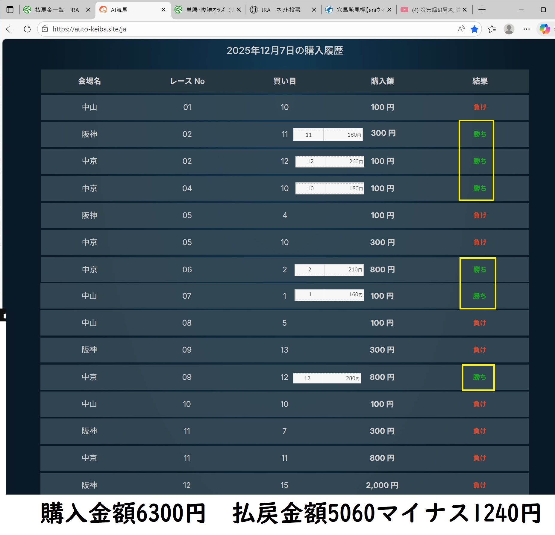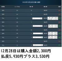 3回外れたら購入のパターンが一番利益がでそうですね。」と書きましたが12月14日も阪神1R,中京2R,中山3R,阪神3Rと4レース連続で外したのでそろそろ当たるのでは?と、思っていたら中京4Rの8番に4900円の買いが入ったので見ていたら8番が3着で的中したので、今までのパターンから次も当たると確信したら、中山5Rの12番に4900円の買いが自動的に入ったので、12番の複勝に1万円追加して合計14.900円的中しました。このように自分なりにアレンジすればビッグドリームも使えます。40万円払っているのでなんとか元を取ろうと必死でございます。 - 3.0投稿日:2025/12/13投稿者:石川五右衛門