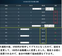 設定を最初の金額を100円に設定すると、1回目100円 外れると2回目300円というふうに的中するまで自動的に金額を増やしながら購入します。ちなみに8回連続で外れると9回目の掛け金は172.600円になります。ここで複勝2倍が的中すると払戻は345.200円です。ここまでの累計は292.900円なので、差し引きプラス52.300円になります。もし、ここで外れたらパンクでマイナス292.900円になりますが、過去には8回以上の外れはないと豪語しているので、その言葉を信用するしかないのです。