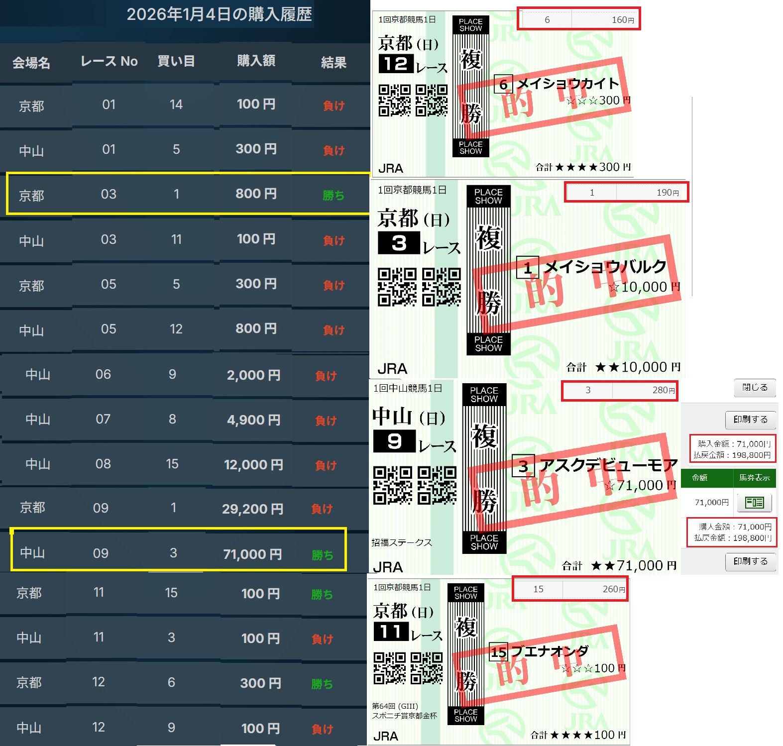 | 2025/1/04 京都金杯 | ① | ✕ | 0円 | -1,000円 | 1,000円 |