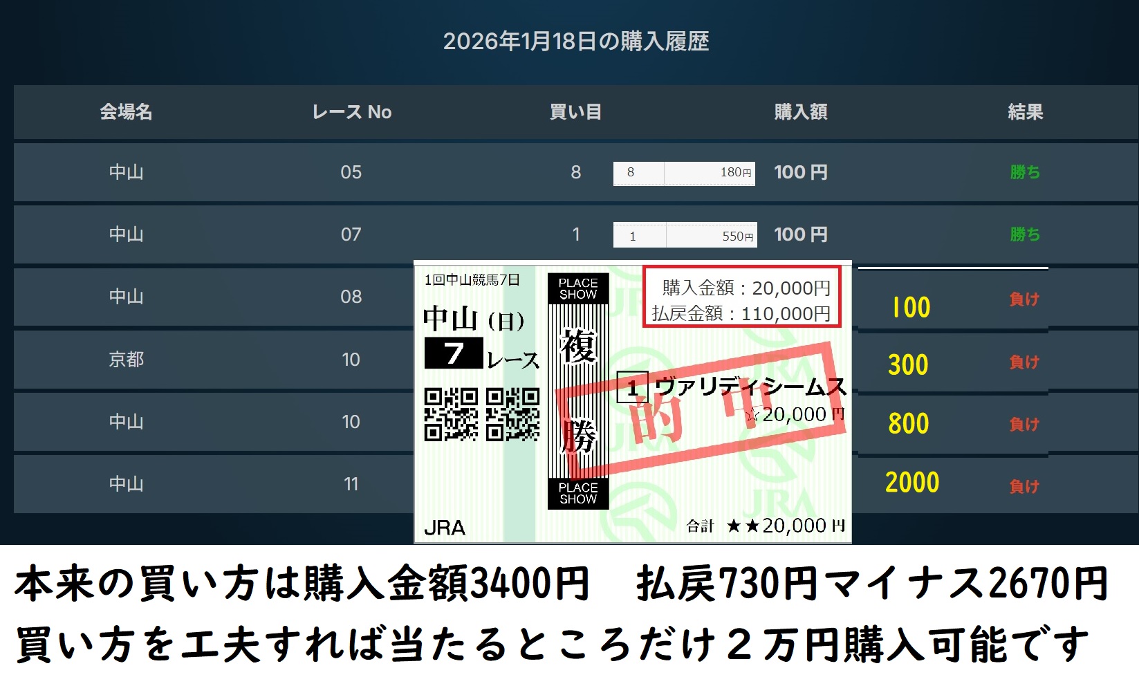 1月18日は購入金額3400円 払戻730円マイナス2670円