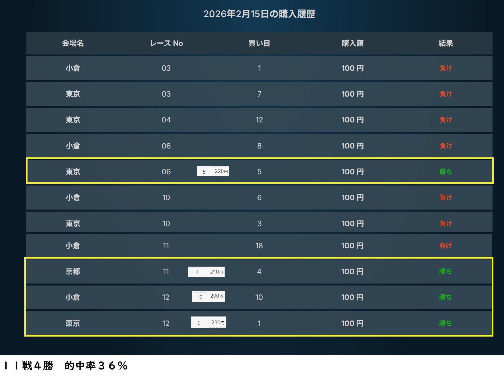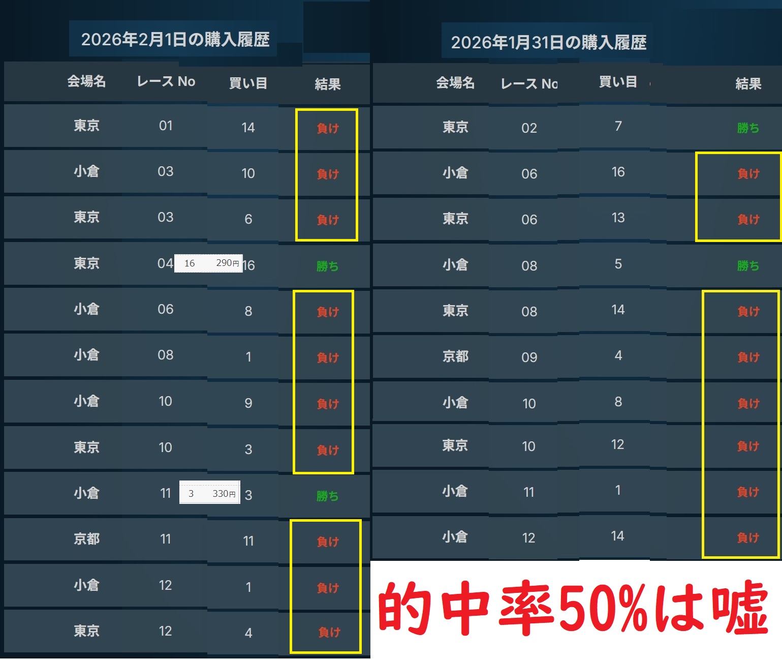 1月31日は10レースで2レース的中。2月1日は12レースで2レース的中。2日間22レースで的中は4レースのみ。