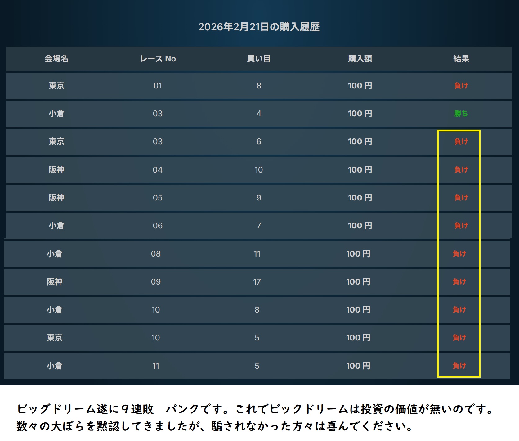 ビッグドリームとは違う買い目を出して6連敗して、ほとんどの方々が見切りをつけたからでしょうか?