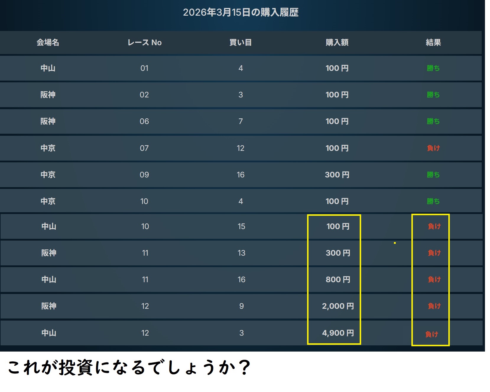 12月28日のようにコンスタントに的中するのなら、「もっと購入金額をあげればいいやん。」と思う方もいるかと思いますが、6連敗した時の金額を考えたら無理なのです。最初の金額が100円でも用意する金額は約30万円です。これを千円にしたら300万円必要です。1万円なら3000万円必要なのです。