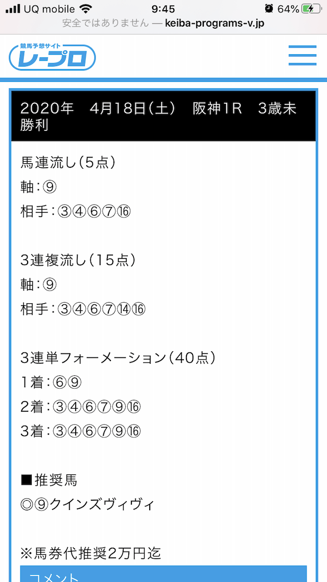 | 2020/4/18 | 阪神1R 3歳未勝利 | ◯ ✕ ✕ | 770円 |