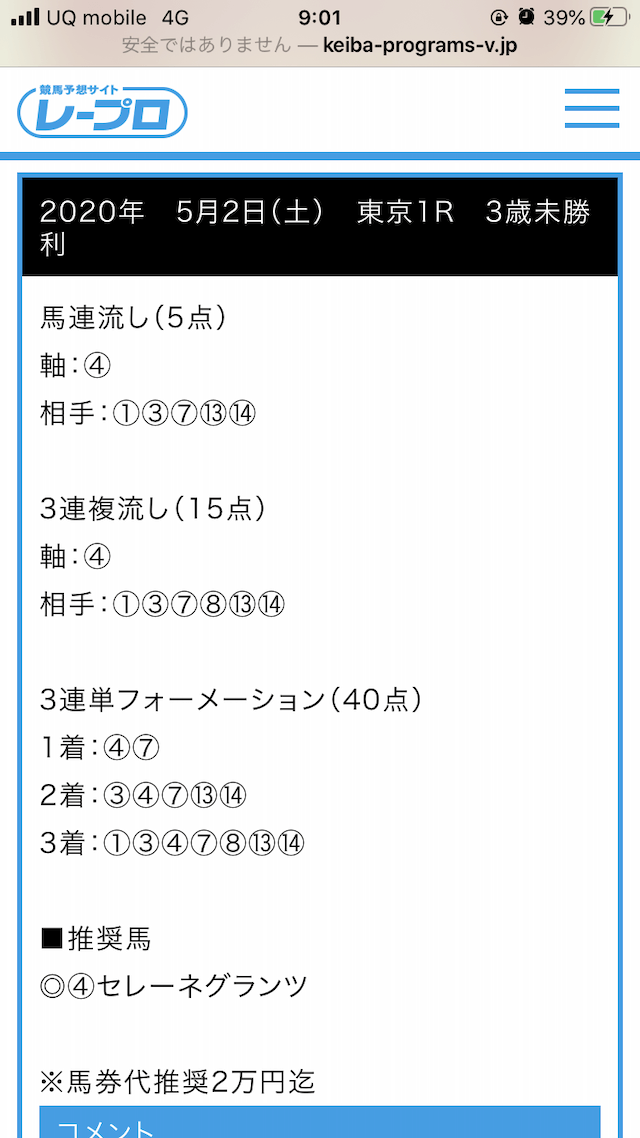 こちらもあくまで無料コンテンツの為、高配当を狙う予想ではないと書かれていますが、無料で予想に参加することが出来るのでレープロを初めて利用する方にはオススメです。