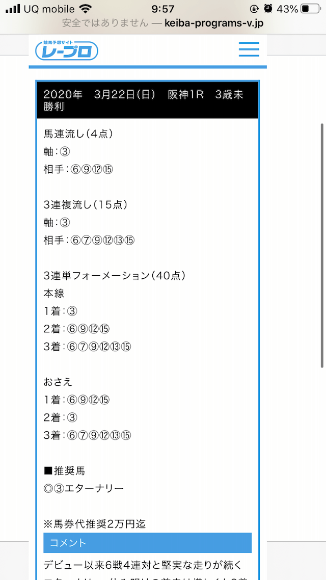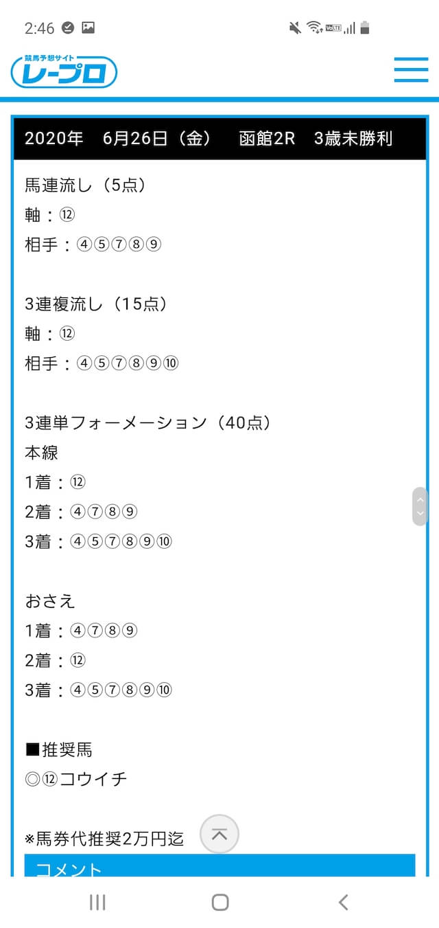 | 2020/6/26 | 函館2R 3歳未勝利 | ◯ ◯ ✕ | 2,310円 |