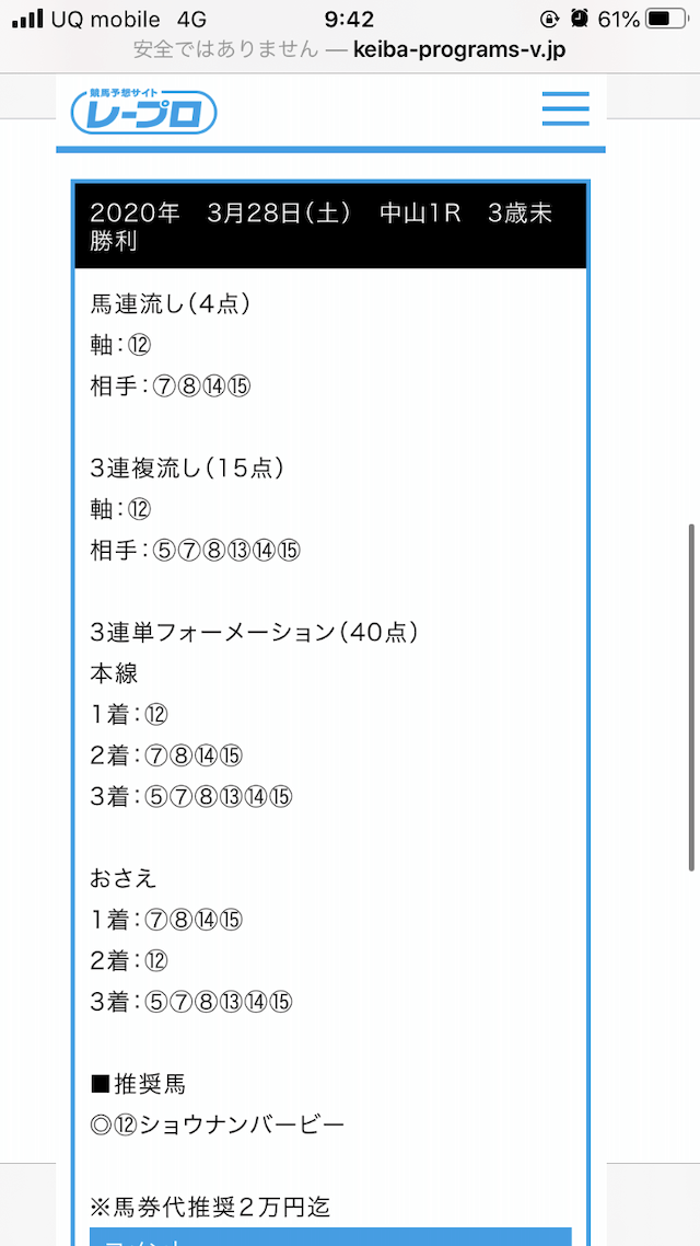| 2020/3/29 | 中京1R 3歳未勝利 | ◯ ✕ ✕ | 4,720円 |