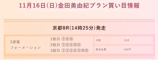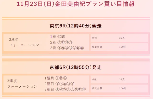 | 金田美由紀 | ’25/11/23 東京6R・京都6R | ◯・◯ | +782,920円 | 12,000円 57,400円 | 852,320円 |