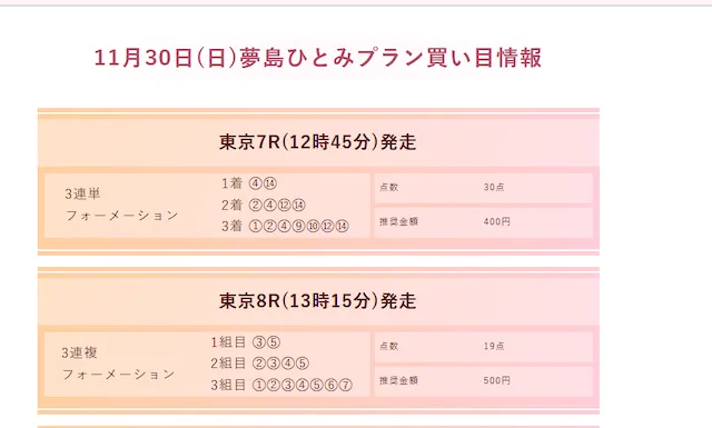 | 夢島ひとみ | ’25/11/30 東京7R・東京8R | ◯・✕ | +56,940円 | 5,000円 21,500円 | 83,440円 |