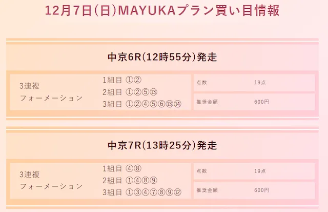 | MAYUKA | ’25/12/07 中京6R・中京7R | ◯・◯ | +253,940円 | 40,000円 22,800円 | 316,740円 |