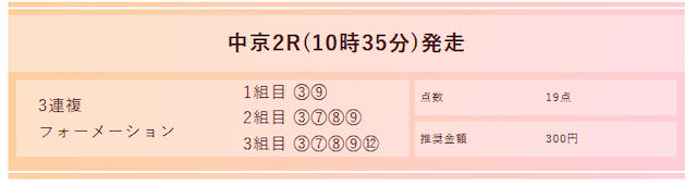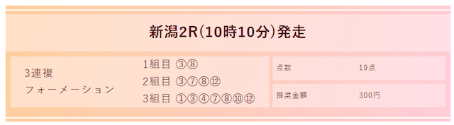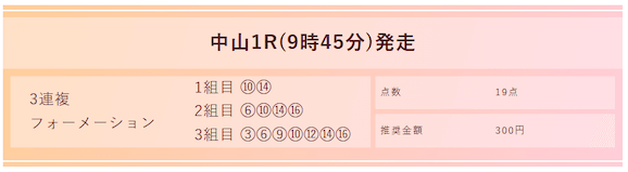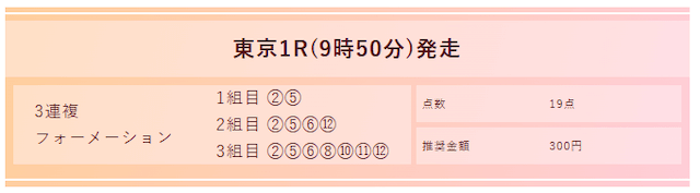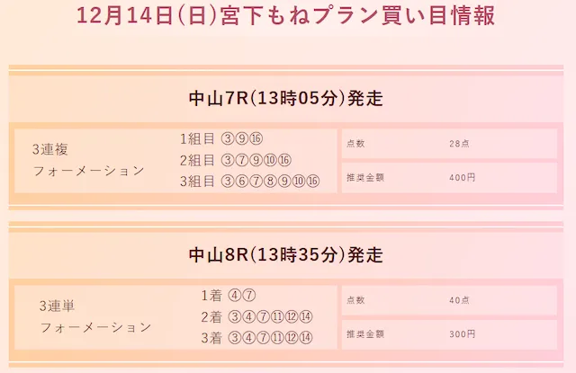 | 宮下もね | ’25/12/14 中山7R・中山8R | ✕・◯ | +702,400円 | 100,000円 23,200円 | 825,600円 |