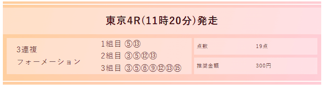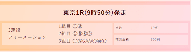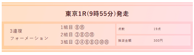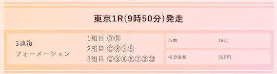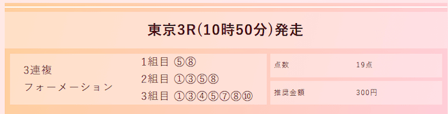 | '25/10/12/東京04R | ◯ | 317,900円 | 19,000円 | +298,900円 | 3連複 |
