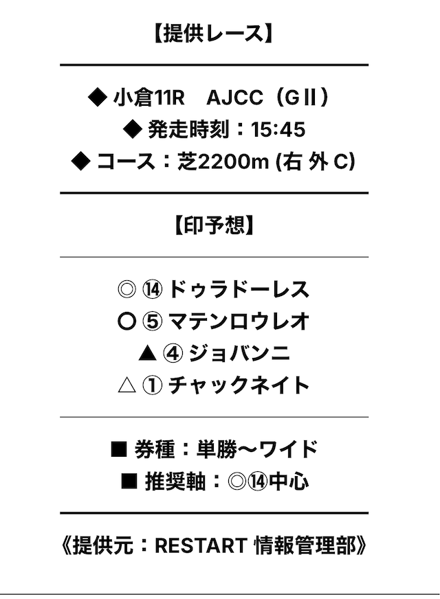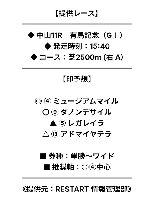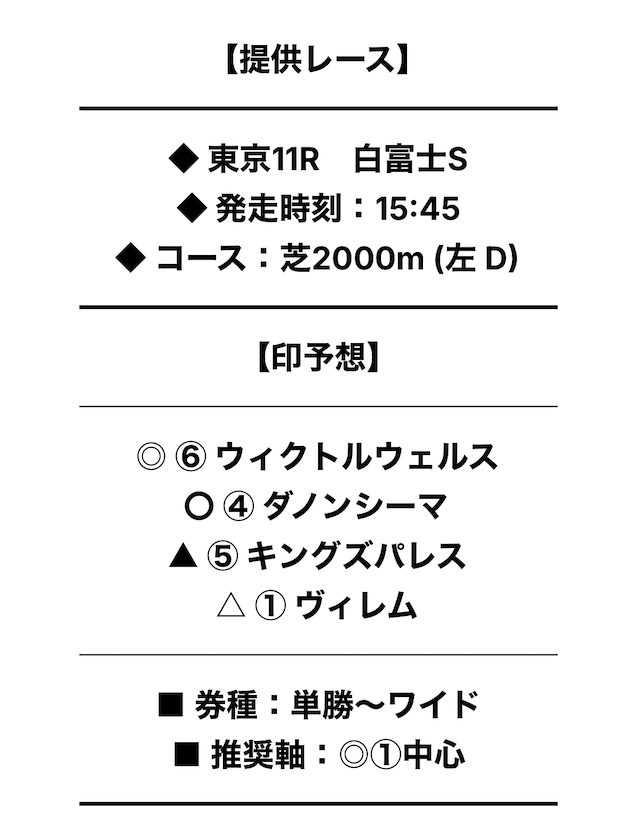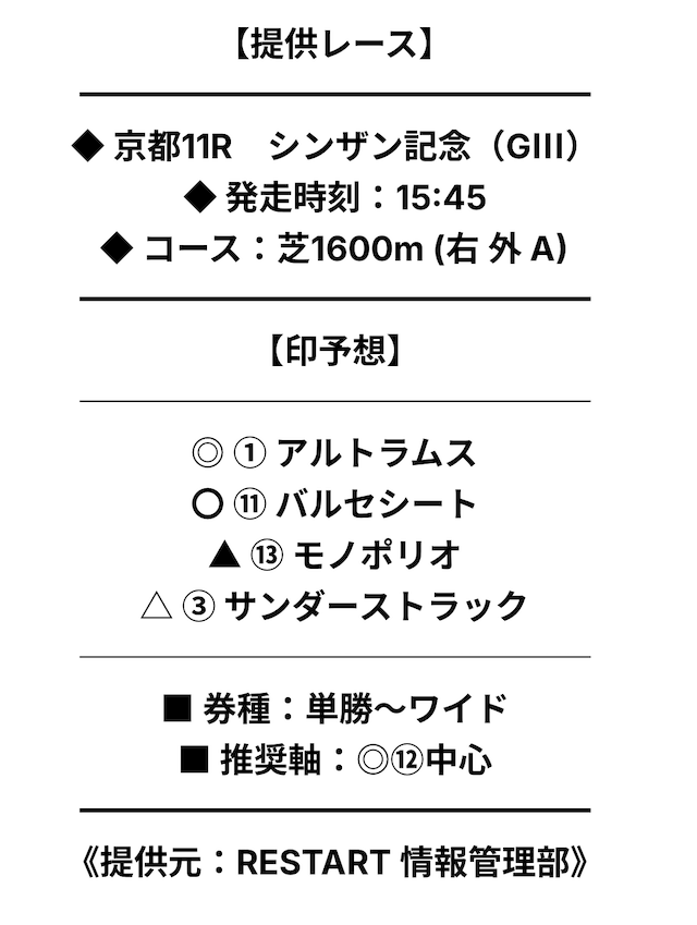 買い目には印予想が記載されており、券種や推奨されている軸馬も明示されていました。