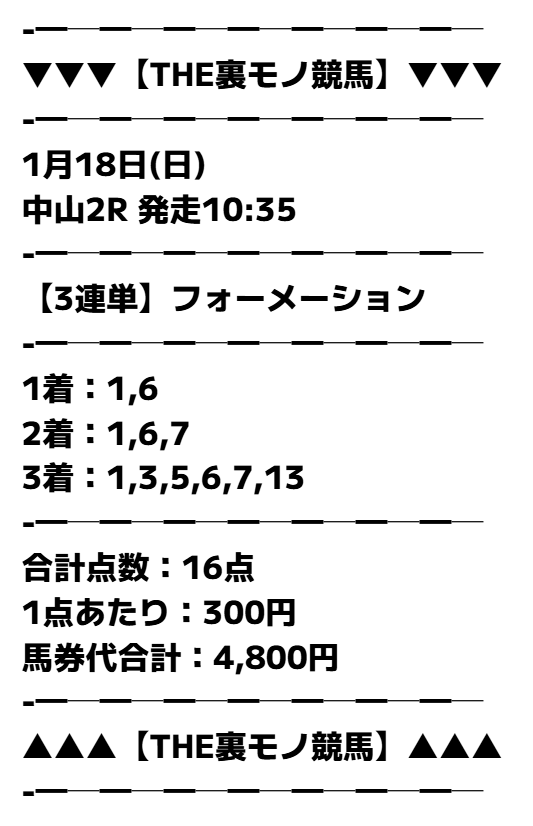 レース日は2026年1月18日の2Rで、公開された買い目はこちらです。