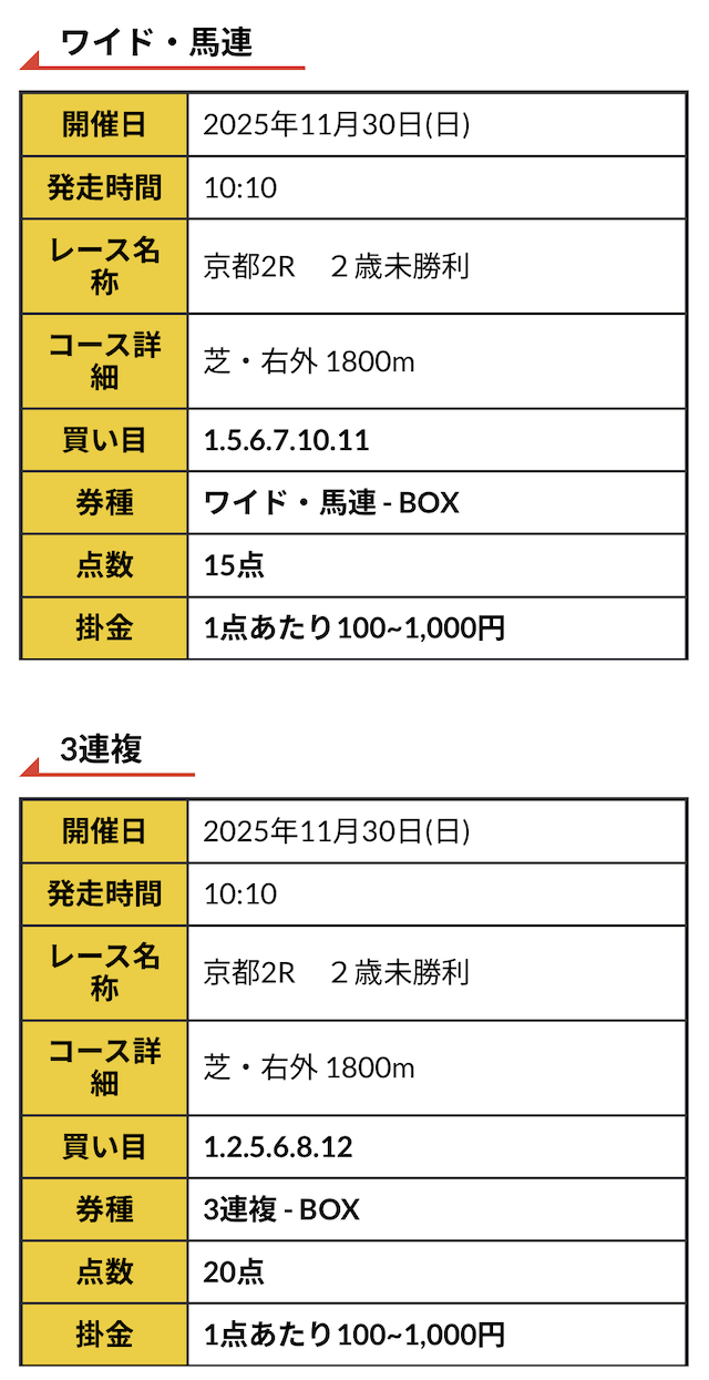今回は券種ごとの優劣を測るため、3券種すべてで馬券を購入。