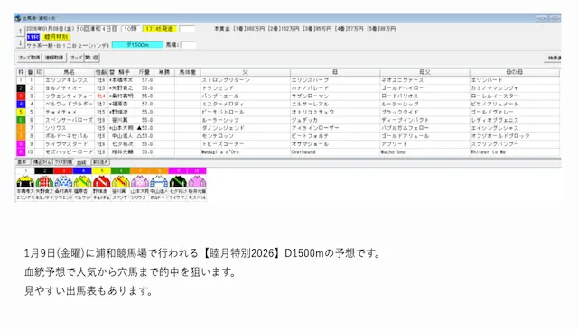 出馬表形式で印と解説が示され、血統的に買える馬が分かりやすく、血統傾向や考え方が学べ、有料版では買い目まで提示。